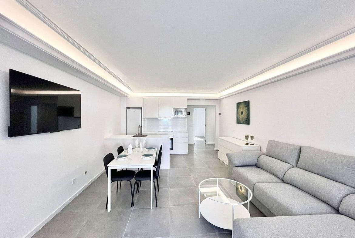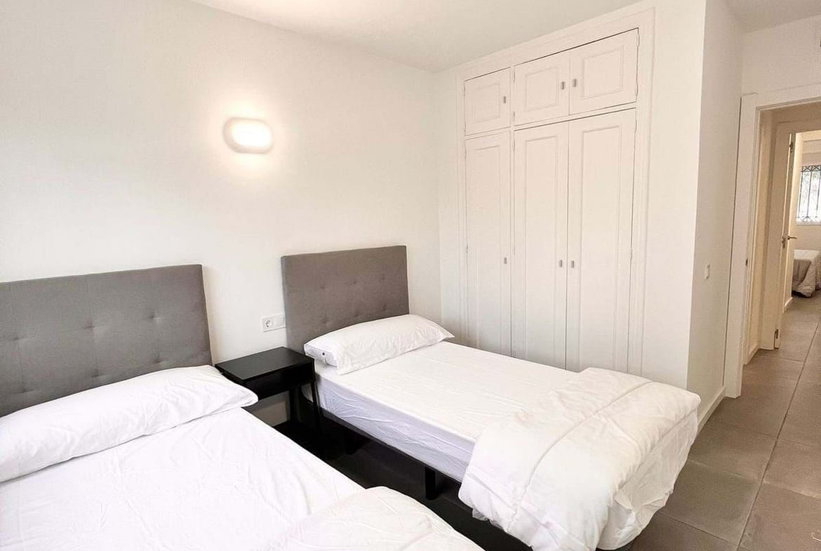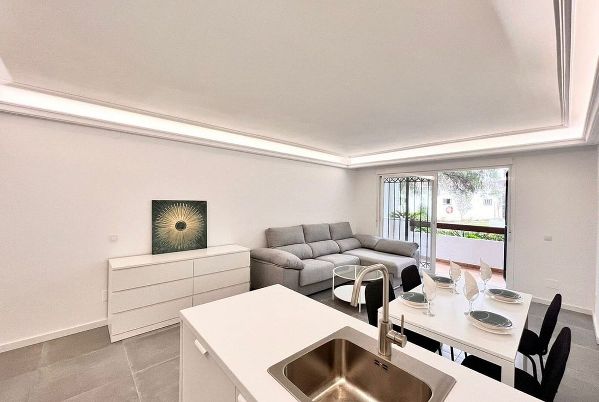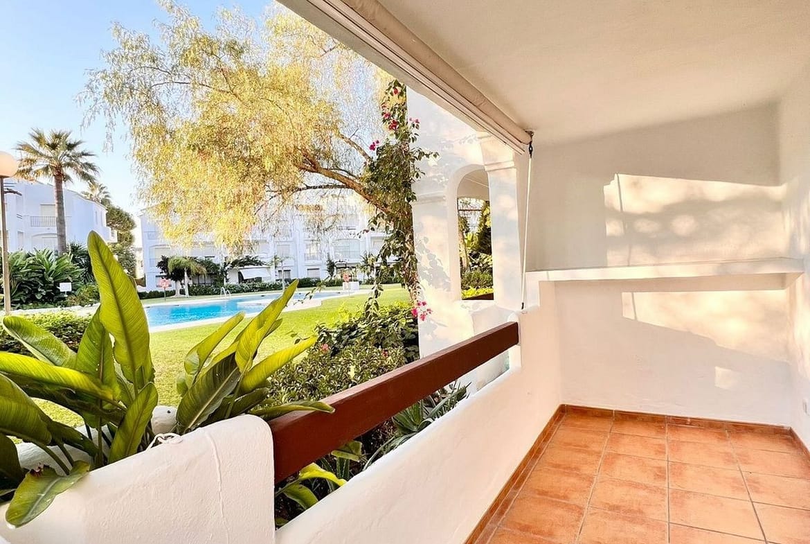 This beautiful three bedroom, ground floor apartment is offered unfurnished and has been renovated throughout to include a spacious living, dining area leading onto its private terrace area overlooking the mature beautifully manicured gardens and communal swimming pool. Contemporary open plan kitchen fully fitted with high quality appliances. Three spacious bedrooms with two modern bathrooms, one of which is en-suite and fully fitted wardrobes. Separate utility room and private parking street parking leading directly to the property. Hot and cold air conditioning throughout.