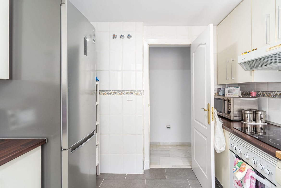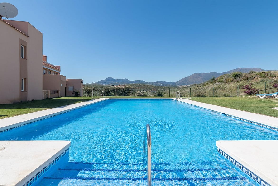 Beautiful ground floor apartment with incredible panoramic sea views. The house has an outdoor garden where you can sunbathe, install a plastic pool, or spend some time with your family and/or friends having a drink. Then we have an entrance that leads to the independent kitchen, which includes a separate laundry room, which provides you with more space and comfort. We go to a very spacious living room with lots of light, with direct access to the covered terrace, with impressive views of the entire bay, where you can relax having a drink, talking, reading, while you watch the sea. And on that same terrace you have stairs that take you to a Solarium, where you can spend time lying down, relaxing, while you observe the incredible views of the sea. It is followed by 3 bedrooms with quite large built-in wardrobes, one of them with an en-suite bathroom for greater comfort and privacy. In addition, the house has centralized air conditioning in all rooms. The house has a very comfortable covered garage. And of course with a community pool to take a good bath or sunbathe. The urbanization is located in a very quiet area, without noise, to enjoy greater tranquility. About 10 minutes from the beach by car, and about 7 minutes from supermarkets, shops, and other restaurants offering a variety. It also has good communication with Estepona-Marbella-Málaga, with access to the highway / highway. It has areas to play golf nearby in about 5 minutes. An ideal place to enjoy good weather, leisure and beach.