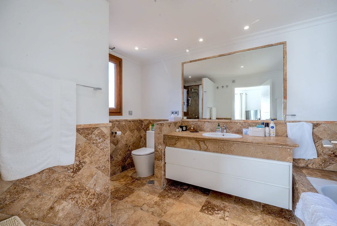 The apartment itself offers on the lower level 2 bedrooms sharing a large bathroom, a kitchen with separate laundry room, and a spacious living room and dining room area which lead out on to another ample terrace. The upper level houses the Master bedroom with ensuite bathroom and opens out on to the large roof terrace just described – there is a separate access to the roof terrace from the stairs, meaning that visitors do not need to pass through the bedroom to access the entertainment area.