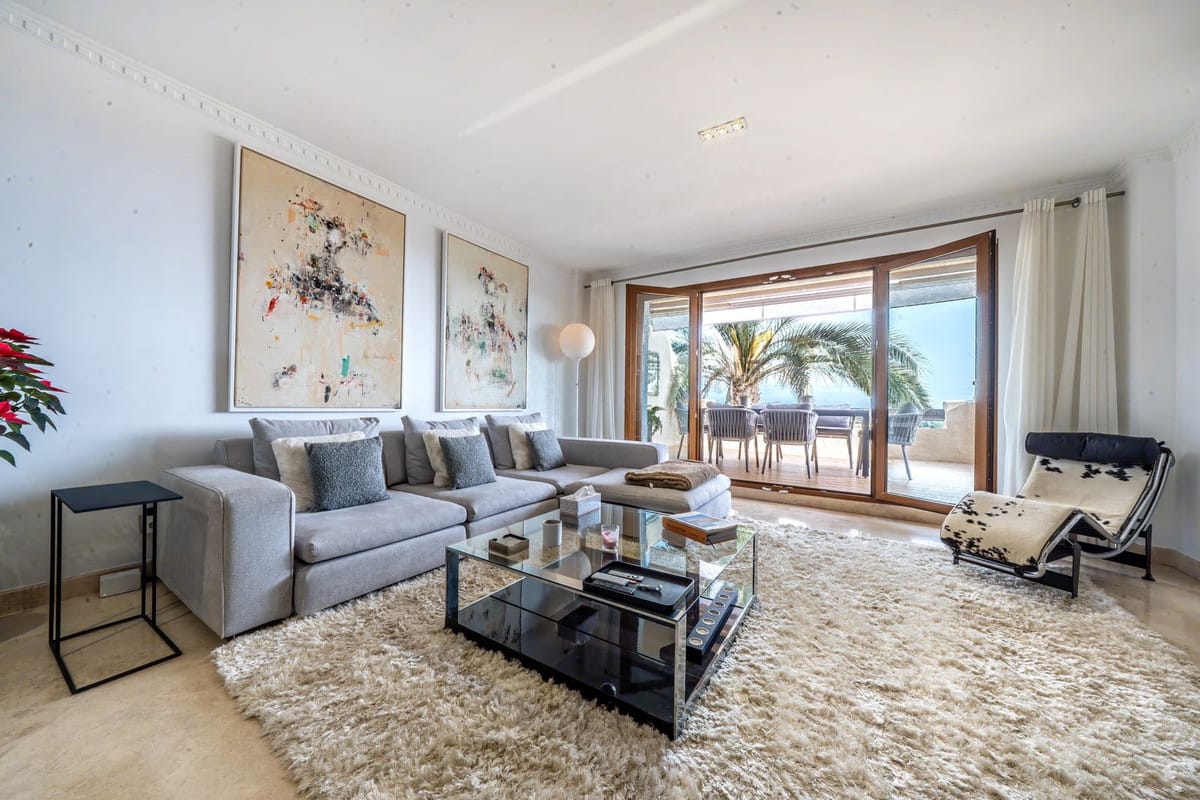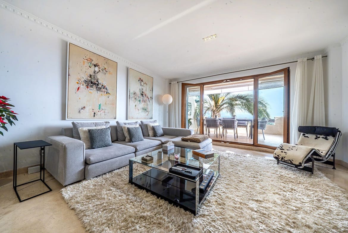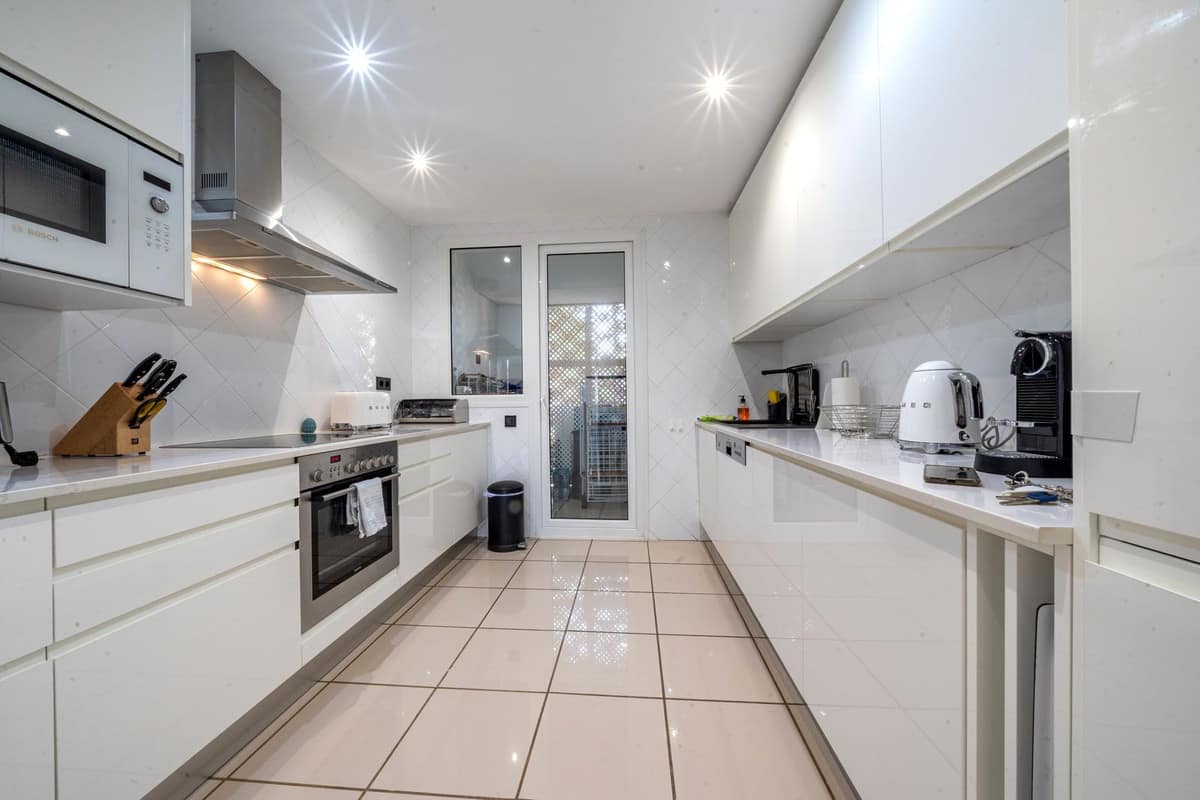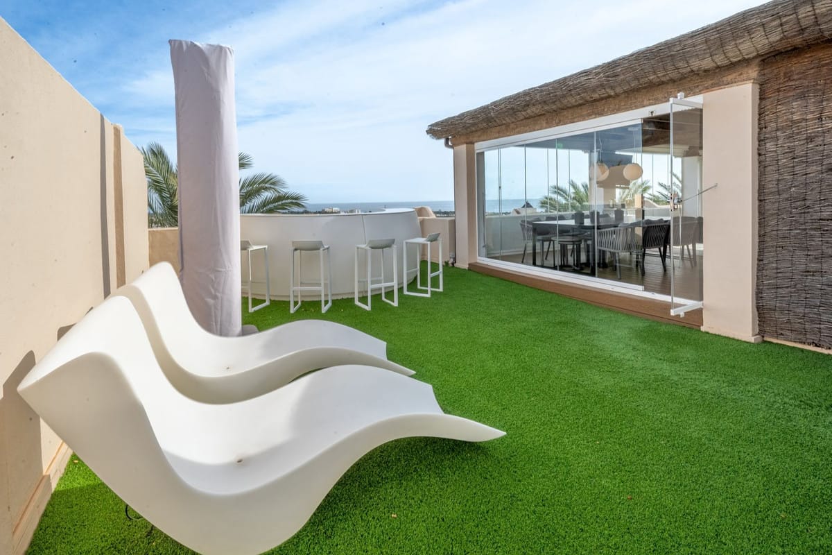 A stunning 3 bedroom duplex penthouse with incredible sea views, presented in impeccable condition. It is not often that such a beautiful property arrives to the market. The present owners have obviously lovingly cared for this beautiful penthouse and it is presented in impeccable condition. The jewel in the crown is the stunning roof terrace that offers panoramic views. Offering a private swimming pool, a great bar and seating area for those social occasions, and plenty of room for sunbeds and dining area. Thats not all that this space offers – part of the terrace has been glazed in with glass windows and houses a complete fully fitted outdoor kitchen, a dining area for 10 and another seating area with large sofas. This spacious area can easily accommodate large groups for entertaining and is tastefully illuminated with discreet non-direct lighting that creates a wonderful atmosphere.