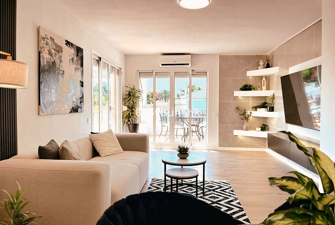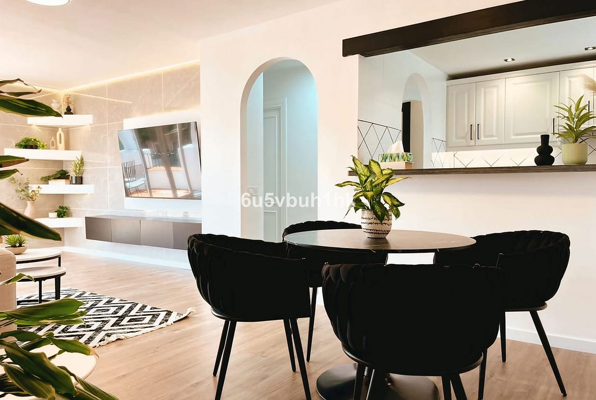 El Paraiso – Just steps behind the chic D-Alicia Café and only 300 m from serene, almost-private beaches, this avant-garde three-bedroom, two-bathroom penthouse embodies modern Mediterranean sophistication. Encompassing approximately 155 m², it showcases bold, gallery-style interiors where striking black-and-white contrasts, wood floors, and abundant natural light create an ever-changing exhibition of style. A sleek black-granite kitchen flows seamlessly into an open living-dining area designed for chic entertaining, while two spa-inspired baths—one featuring a deep soaking tub—offer indulgent comfort. Crowned by a private Saltillo-tiled rooftop terrace, the residence invites sunset dinners, starlit gatherings, and effortless al-fresco living. Surrounded by acclaimed restaurants, wine bars, and designer boutiques, this penthouse is more than a home: it’s a curated lifestyle for the sophisticated buyer seeking elegance, edge, and everyday inspiration.