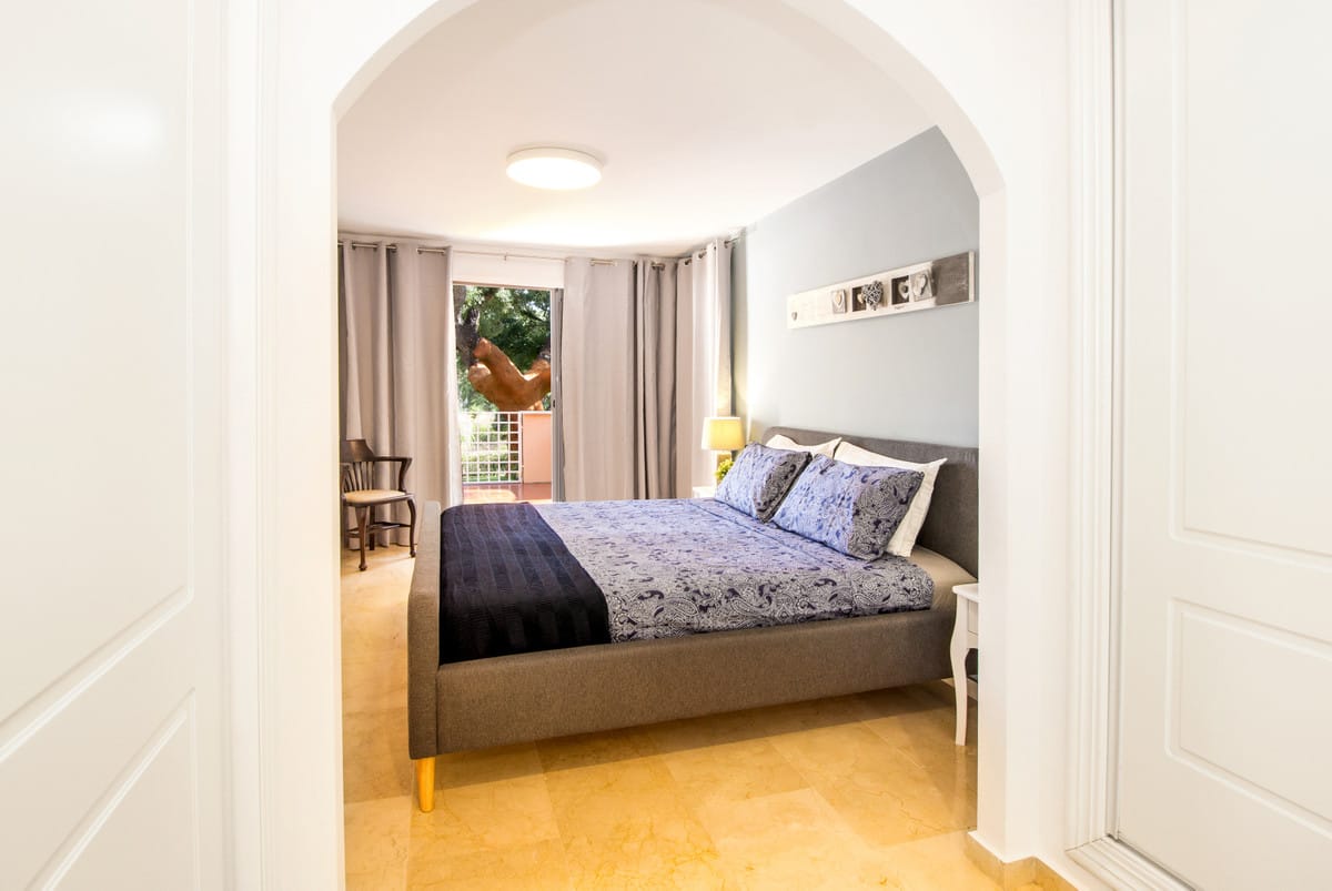 Jardines de Santa Maria Golf, Elviria – available for medium term rental: This is a 3 double bedroom ground floor apartment, perfect for a family looking for comfortable surroundings. Beautifully furnished in a contemporary style the Master Bedroom boasts a large ensuite bathroom with corner bath, dressing area and direct access to the terrace. The combined Lounge/Diner (with dining table for up to 6 diners) and L-shaped sofa also opens out to the spacious terrace area with chill-out seating, dining area and umbrella. High speed fibre optic wifi is provided for those who need to stay in touch or work remotely and there is a huge variety of TV channels as well as Roku smart TV box. The 2nd bedroom has a queen size double bed and the 3rd bedroom two single beds – with these bedrooms sharing the 2nd bathroom (with walk in shower). The kitchen has been fully renovated and is completely equipped with microwave, hob, oven, american style refrigerator etc whilst the utlity room houses the washing machine.