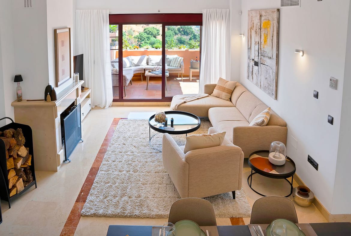 The 3 bedroom la Mairena apartment is accessed from a large private underground parking space in the garage below the building. Next to this there is also a spacious storeroom. Take the elevator up 2 floors and you arrive at the front door of this upper Elviria home. With the front door opening to reveal the living room with double-height ceiling, the space and light from which this property benefits is wonderful. To the right of the front door is the large enclosed and brand newly-fitted kitchen which has been elegantly updated with entirely new storage units, with silestone countertops, clean walls and super-functional lighting system showing and clean bright work surfaces. The kitchen benefits from a spacious utility room at the rear of the apartment, which has windows for natural light and ventilation.