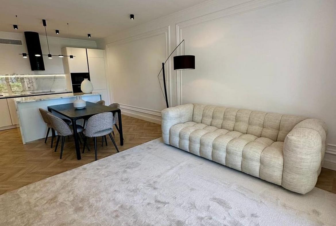 The apartment has been recently renovated and is decorated in a modern style using high-quality materials and stylish design solutions.