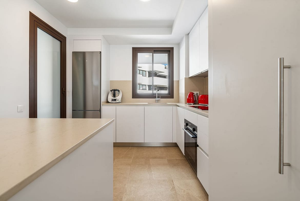 Being a corner unit, the apartment benefits from large windows on multiple sides, allowing natural light to flood the interiors throughout the day. Designed with comfort and style in mind, the apartment offers a bright open-plan living area. From the living room, large sliding doors open onto a spacious south-facing terrace, the perfect place to relax or entertain while enjoying the Mediterranean sunshine.