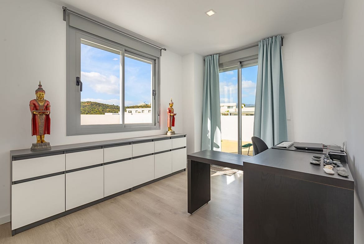 On the same floor as the living and bedrooms, this penthouse has terraces on three sides, including east- and southwest-facing ones, with panoramic views. An outdoor staircase leads to a very large roof terrace with spectacular 360° panoramic views of the sea, the mountain range, and the pool.