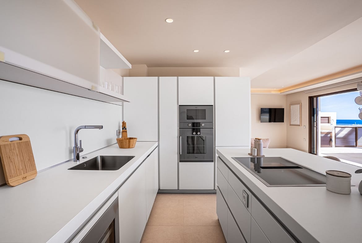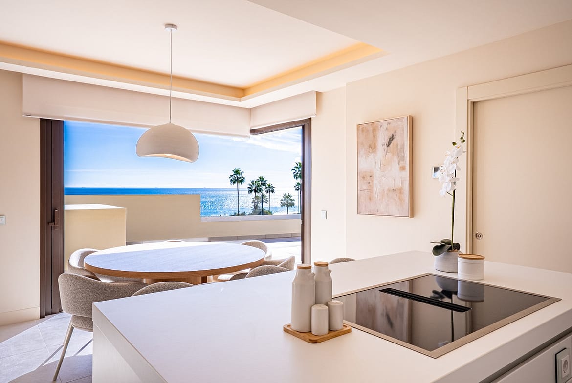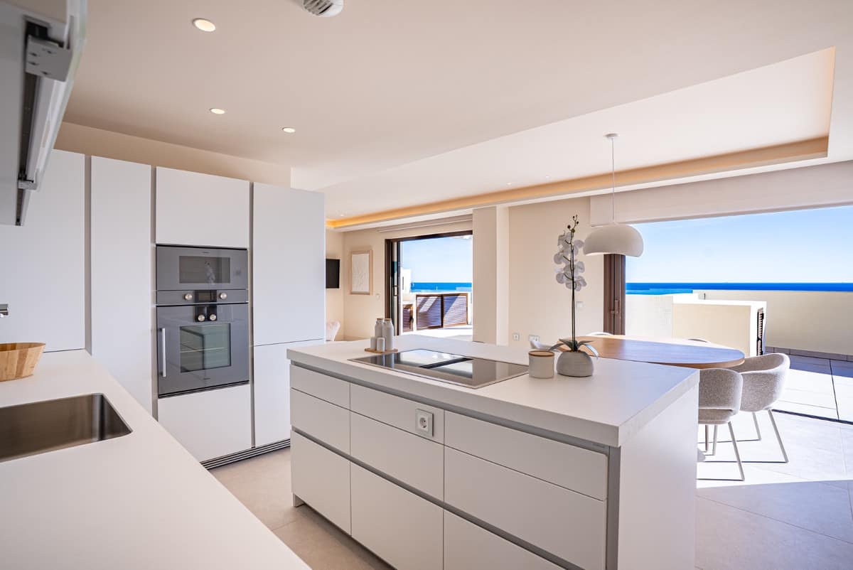 This modern 3 bed 2 bath duplex penthouse sits frontline to the beach in Estepona and offers direct access to the sand. The home has huge windows that fill the living room with natural light and a fully fitted kitchen with an island. You also get a private pool and large terrace spaces plus a private terrace off the master bedroom.