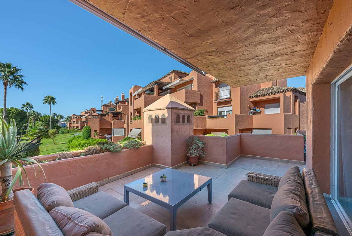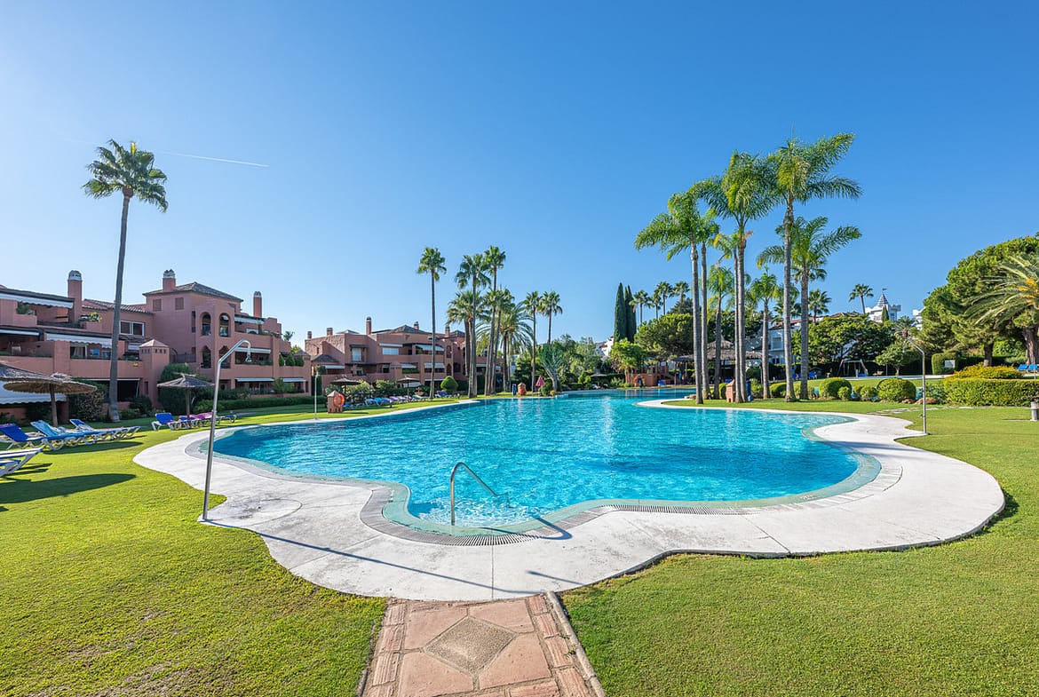 This fabulous apartment is located in one of the best and most exclusive developments in Guadalmina Baja. It faces south with views of the lush tropical communal gardens and the oversized pool area that resembles a beach.