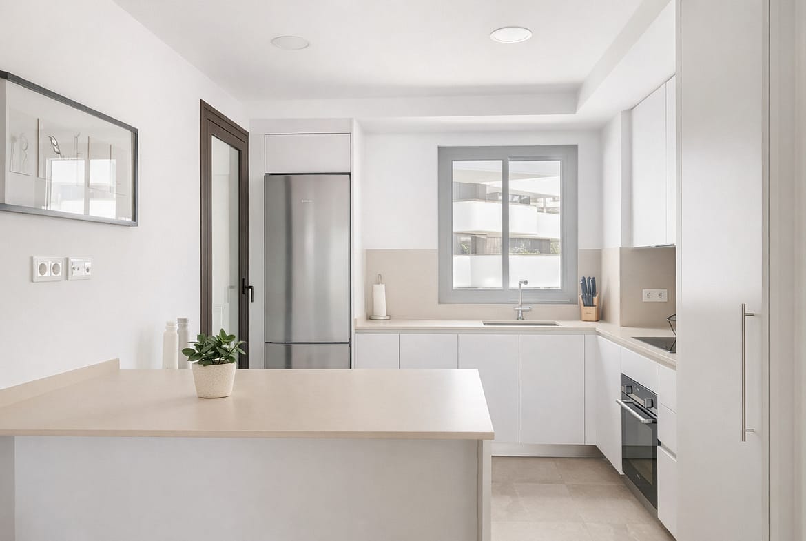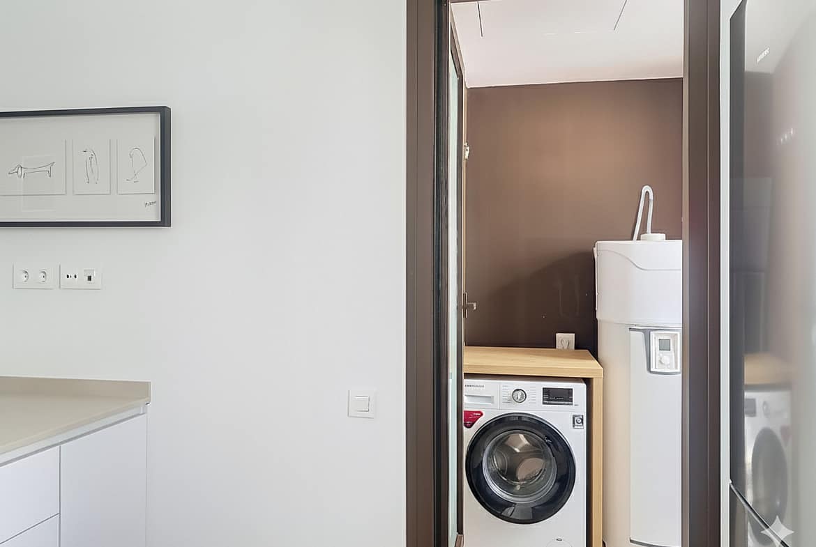 The main floor of the penthouse is designed for both comfort and practicality. The spacious living area benefits from porcelain floors, double glazing, and glass doors that open onto a private terrace, allowing natural light to flood the interior and providing urban and sea views. The open plan, fully fitted kitchen is equipped with modern appliances, a peninsula and includes a dedicated laundry room, making daily routines efficient.