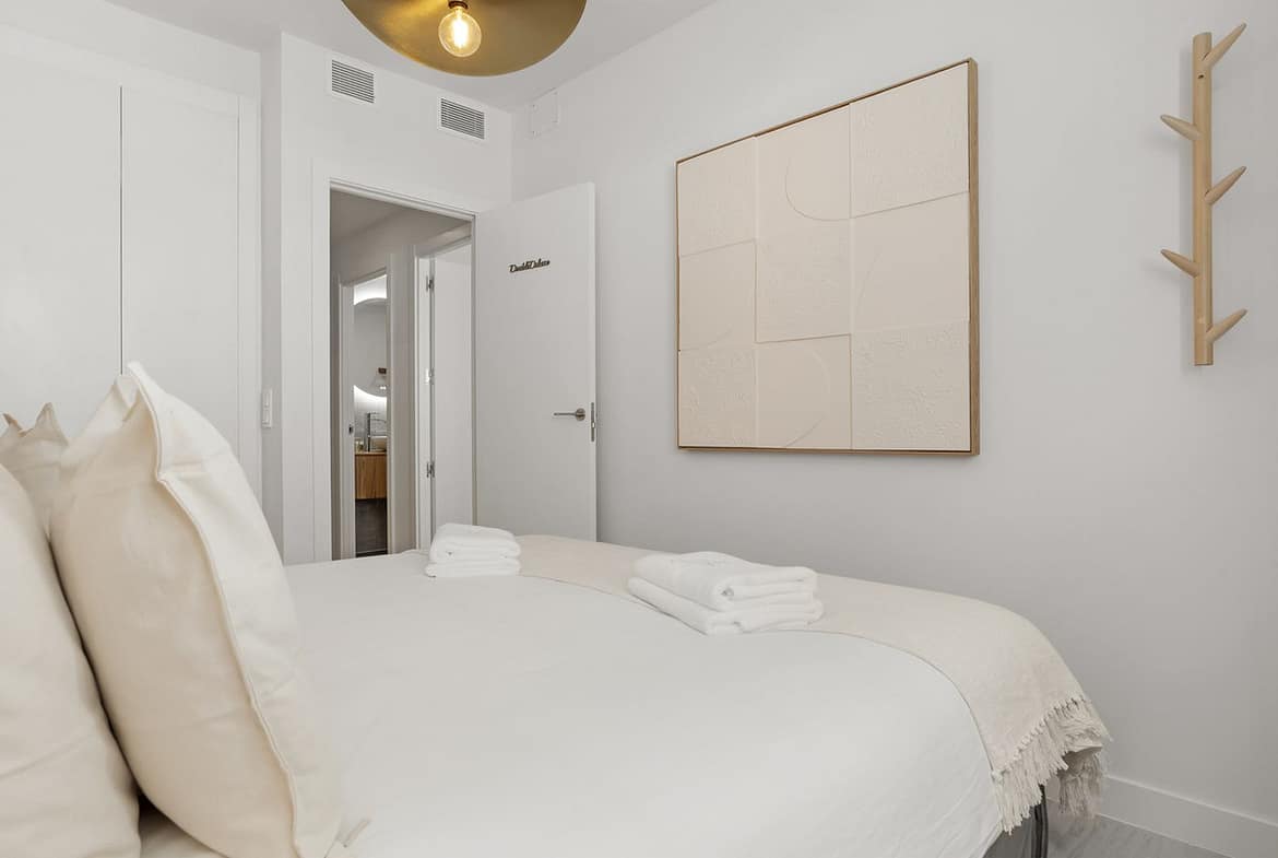 The apartment offers three spacious bedrooms and two full bathrooms. The master bedroom features a double bed and fitted wardrobes. The second bedroom also has a double bed, while the third bedroom is furnished with two single beds — perfect for children or guests.