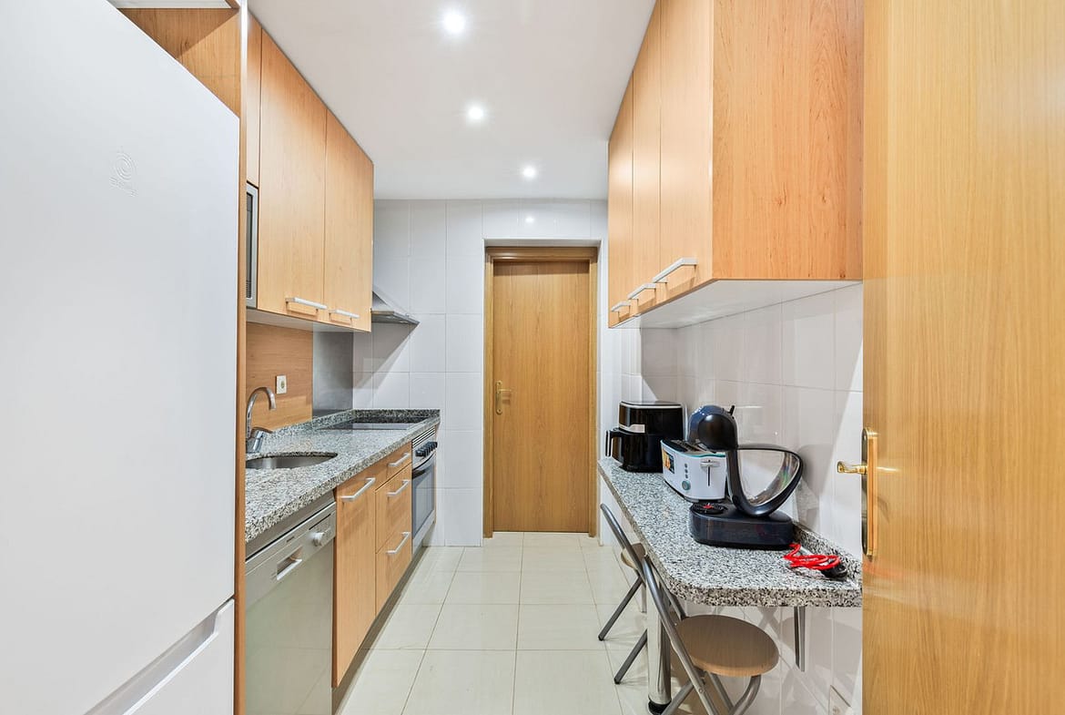 • A spacious designer kitchen to the right combines style and functionality.