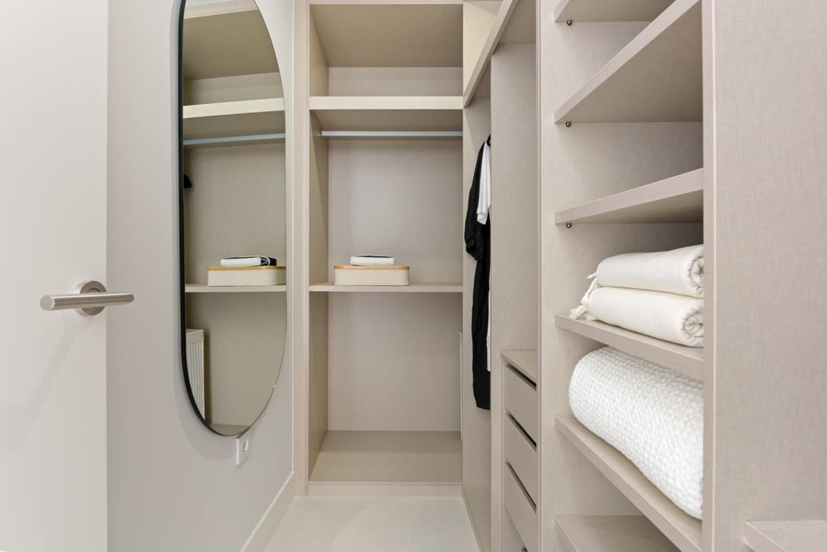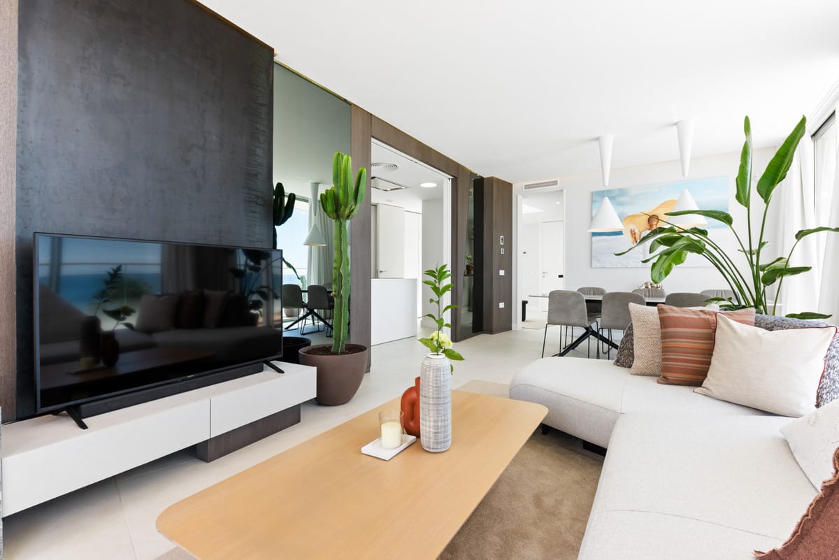 Accommodation comprises three bedrooms, including a principal suite with direct terrace access and sea views. Bathrooms are finished to a high standard, complementing the clean, modern aesthetic throughout.
