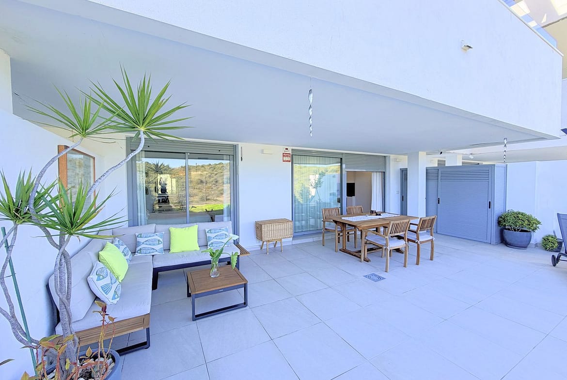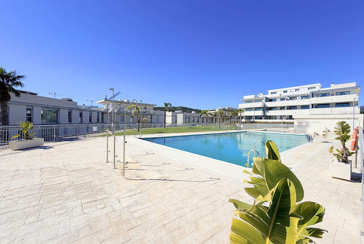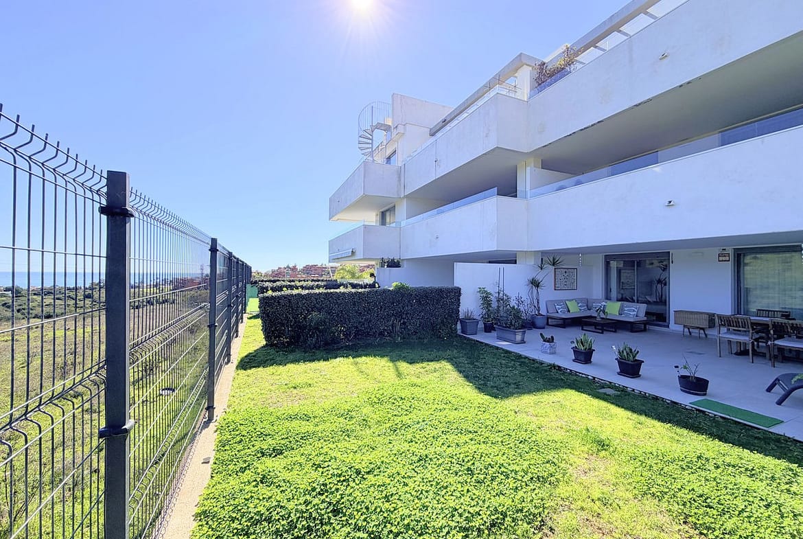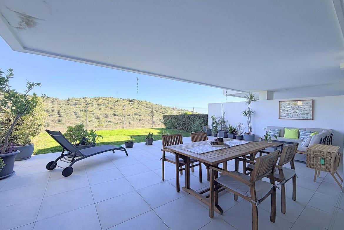 Fantastic ground-floor apartment with a large private garden and open views of the sea and mountains, located in Estepona, in a contemporary residential complex completed in 2021, just 5 minutes by car from the town center and 15 minutes from Sotogrande. The development, with modern design and clean lines, features a swimming pool and well-maintained green areas, creating a pleasant and highly valued environment. The property is in excellent condition, with high-quality renovations and finishes throughout. The open-plan living area combines lounge, dining space, and fully equipped kitchen with custom storage solutions. From here, you can access a spacious covered terrace, ideal for year-round enjoyment. Other upgrades include motorized blinds with a security locking system. The private garden adds a highly desirable extra, providing space, privacy, and multiple possibilities to create different outdoor areas. The master suite features a dressing area, direct access to the porch, and a fully renovated bathroom. A parking space and storage room are included, adding practicality and convenience. An ideal opportunity for those looking for a modern, comfortable home ready to move into, perfect as a permanent residence or a second home on the Costa del Sol.