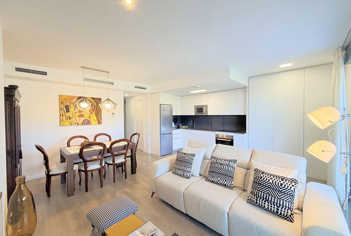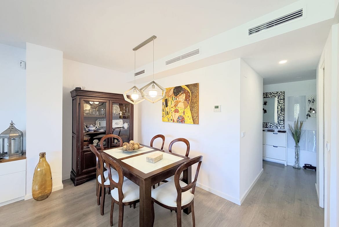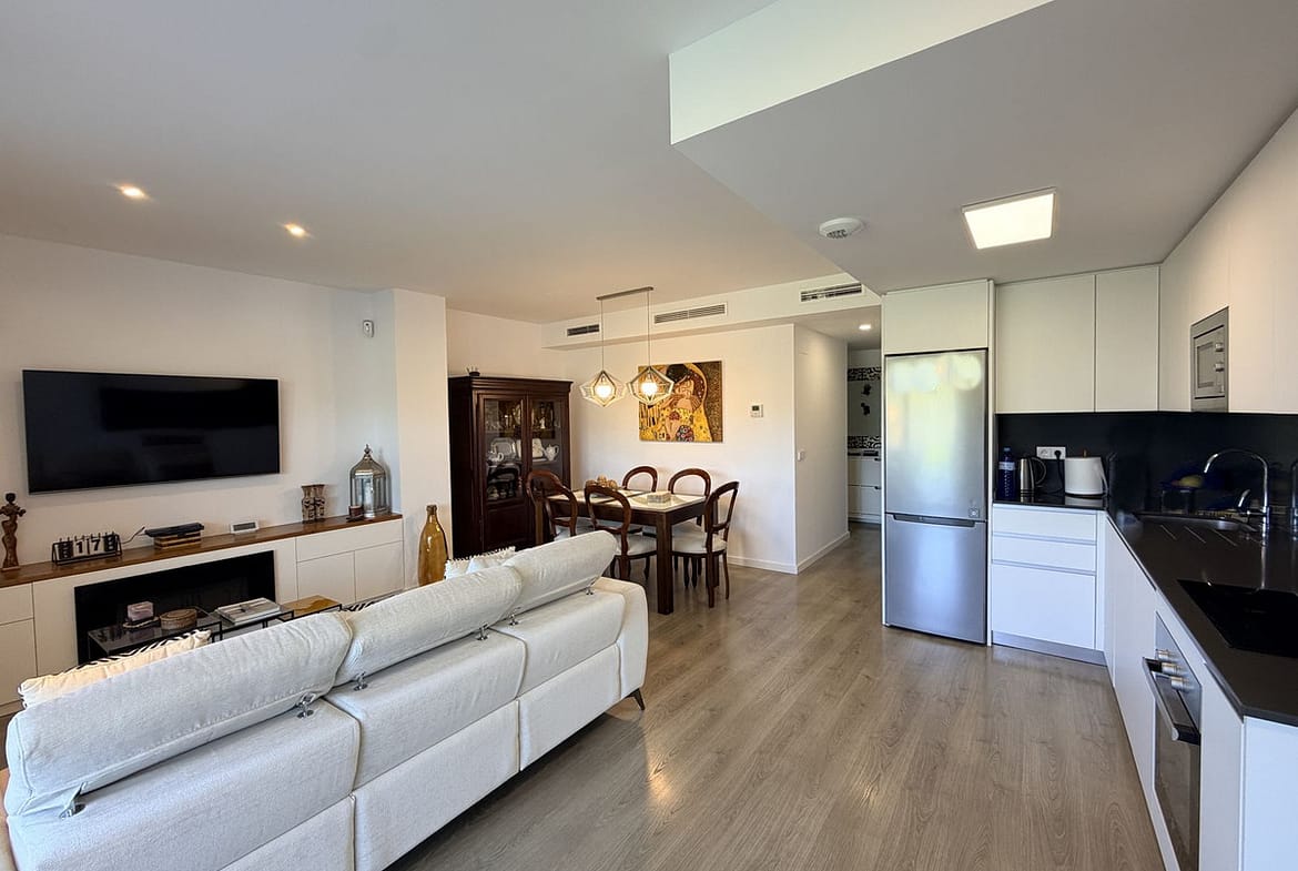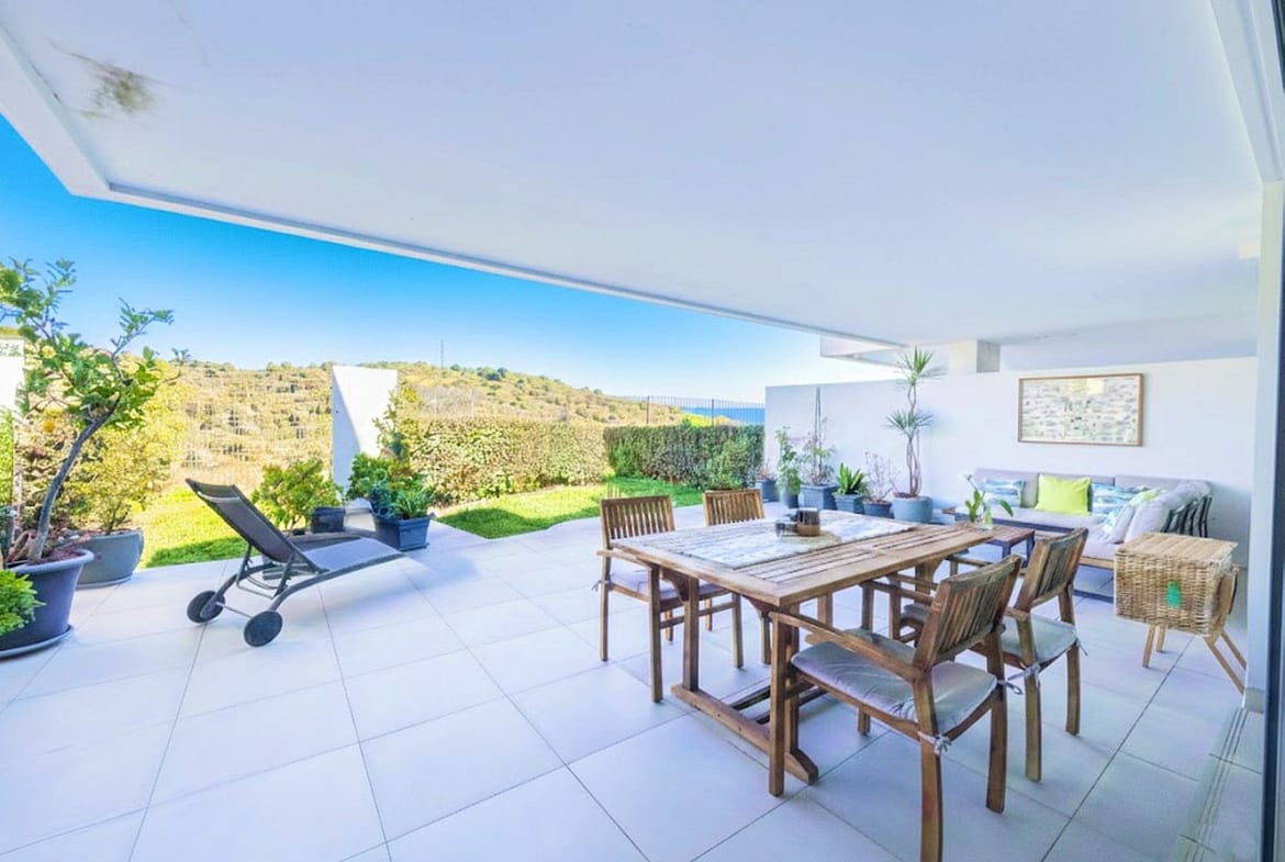 Fantastic ground-floor apartment with a large private garden and open views of the sea and mountains, located in Estepona, in a contemporary residential complex completed in 2021, just 5 minutes by car from the town center and 15 minutes from Sotogrande. The development, with modern design and clean lines, features a swimming pool and well-maintained green areas, creating a pleasant and highly valued environment. The property is in excellent condition, with high-quality renovations and finishes throughout. The open-plan living area combines lounge, dining space, and fully equipped kitchen with custom storage solutions. From here, you can access a spacious covered terrace, ideal for year-round enjoyment. Other upgrades include motorized blinds with a security locking system. The private garden adds a highly desirable extra, providing space, privacy, and multiple possibilities to create different outdoor areas. The master suite features a dressing area, direct access to the porch, and a fully renovated bathroom. A parking space and storage room are included, adding practicality and convenience. An ideal opportunity for those looking for a modern, comfortable home ready to move into, perfect as a permanent residence or a second home on the Costa del Sol.