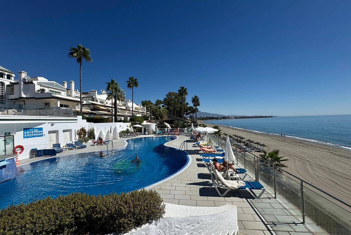 The apartment has been renovated and includes air conditioning, fitted wardrobes, a storage room and lift access. The gated community benefits from a communal swimming pool and a well-maintained beachfront environment.