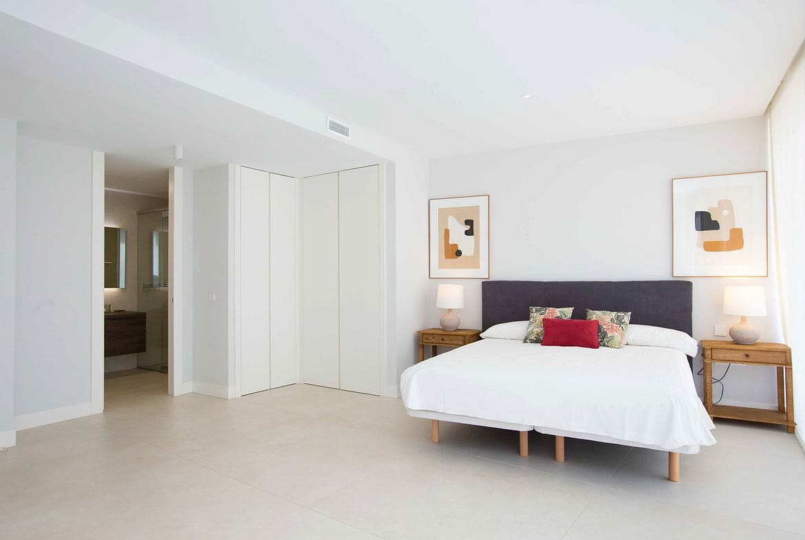 The apartment is designed with spacious rooms and large windows that maximize natural light and offer stunning views of the Mediterranean from the main living areas. The open-plan kitchen with dining area is elegant and modern, equipped with high-quality appliances, and connects to a spacious terrace. The apartment includes air conditioning, underfloor heating, and a home automation system for climate and blinds control. It also comes with a storage room and two underground parking spaces.