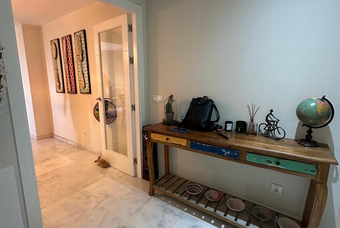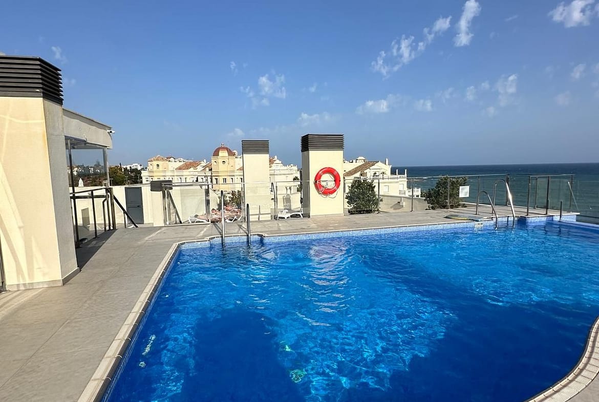 “The apartment is located west of Marbella on the “New Golden Mile” few minutes from the lively marina of Puerto Banus and the more traditional town and beaches of Estepona. The building has a beautiful roof top infinity pool with views across to Africa. Close to all amenites and surrounded by 5 star resorts and public transport, this southwest beautiful ground floor apartment consists of a bright living and dining area with access to the terrace and the private garden. Three bedrooms with built-in wardrobes and two bathrooms, one en-suite. Fully equipped kitchen and laundry room. The apartment comes with an underground parking and storage room. Security in the compound, solar panels and only few steps to the beach and coastal walkway.”