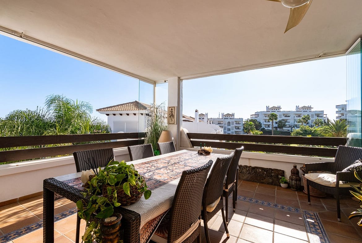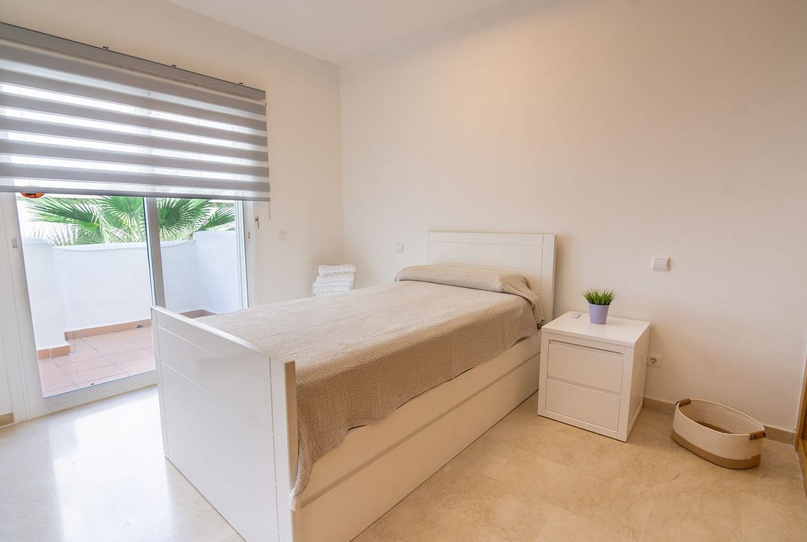 Charming first-floor apartment located in a gated and beautifully maintained urbanization, just five minutes by car from the beach and several golf courses, and ten minutes from both Estepona town and Puerto Banús. The complex stands out for its high-quality construction and well-kept tropical gardens, and offers a large communal swimming pool, a security system with CCTV and controlled access. The property includes a private underground parking space and a good-sized storage room.