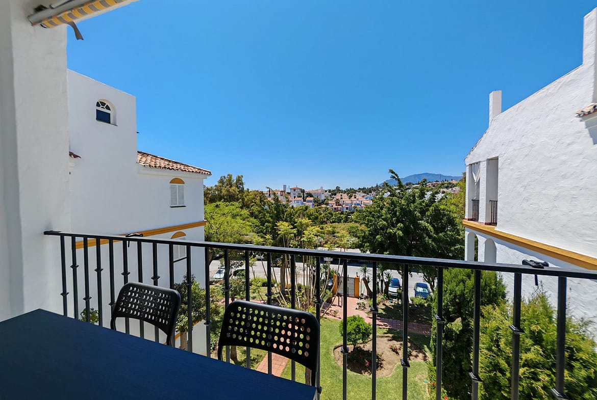 Penthouse for sale in Atalaya Golf, Estepona with 3 bedrooms, 2 bathrooms, 1 on suite bathroom, 1 toilet and with orientation south/west, with communal swimming pool and communal garden. Regarding property dimensions, it has 118 m² built and 43 m² terrace. Has the following facilities transport near, air conditioning, fully fitted kitchen, jacuzzi, guest room, solarium, double glazing, guest toilet, private terrace, kitchen equipped, living room, sea view, mountain view, golf view, security shutters, internet – wi-fi, covered terrace, fitted wardrobes, gated community, lift, garden view, close to children playground, close to sea / beach, close to golf, uncovered terrace, glass doors, open plan kitchen, balcony, optional furniture, wheelchair-accessible, recently renovated / refurbished, ceiling cooling system, ceiling heating system, close to shops, close to town, close to schools and pets allowed.
