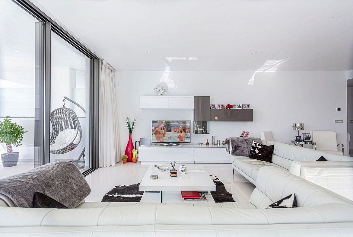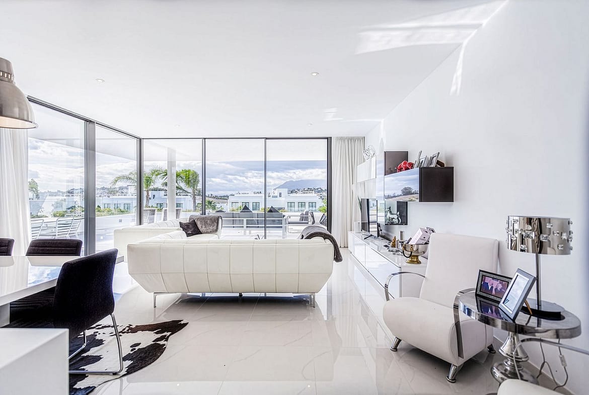 The apartment itself features a bright and spacious open-plan living area, enhanced by floor-to-ceiling sliding doors that flood the space with natural light and seamlessly connect the interior to a large west-facing terrace. This outdoor area is perfect for al fresco dining, entertaining guests, or simply enjoying the warm Mediterranean sunsets.