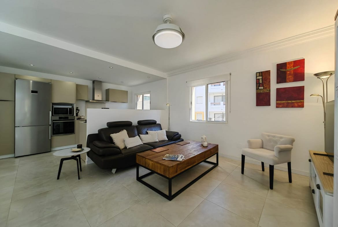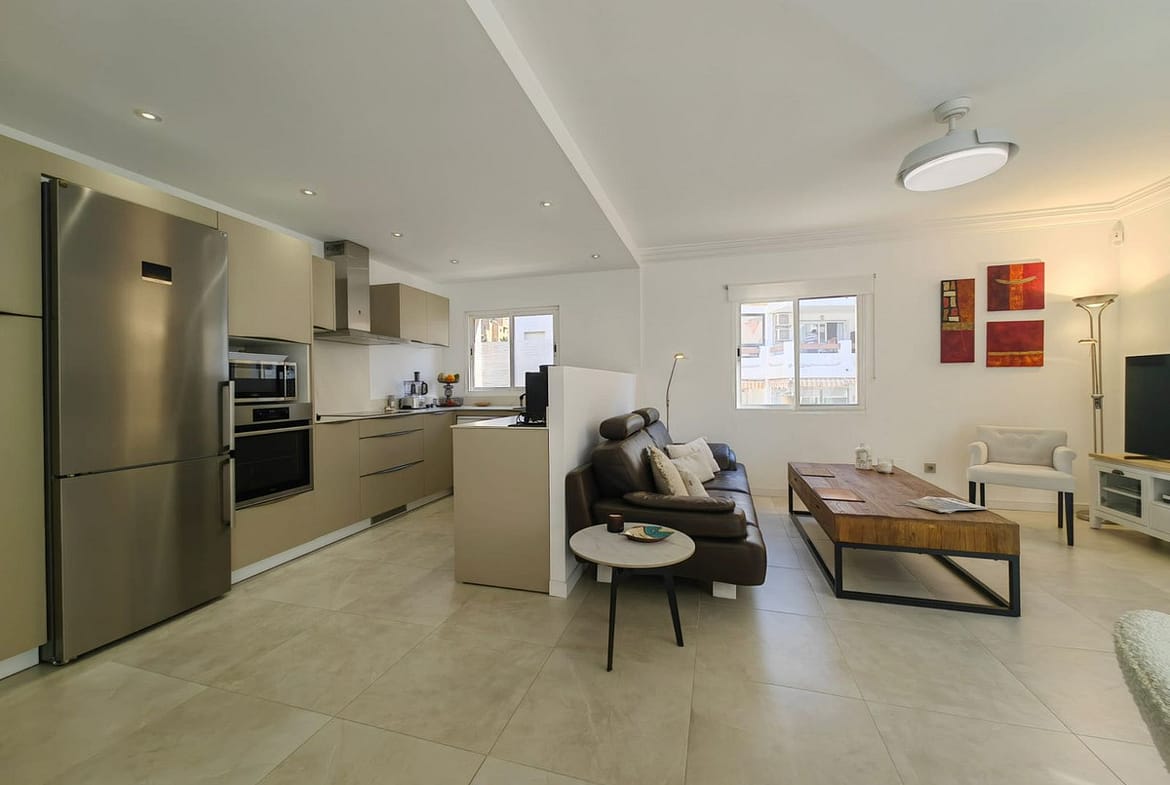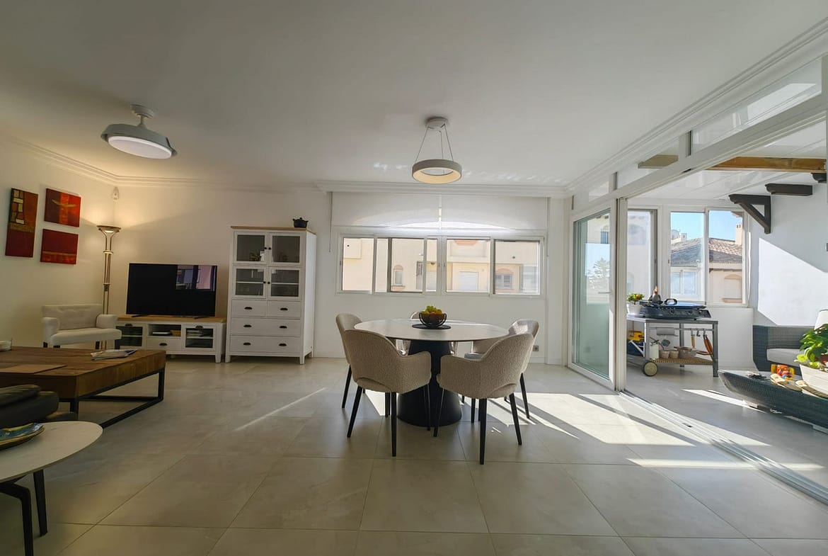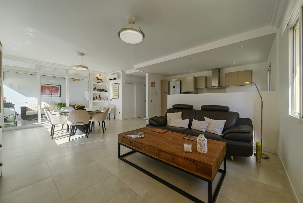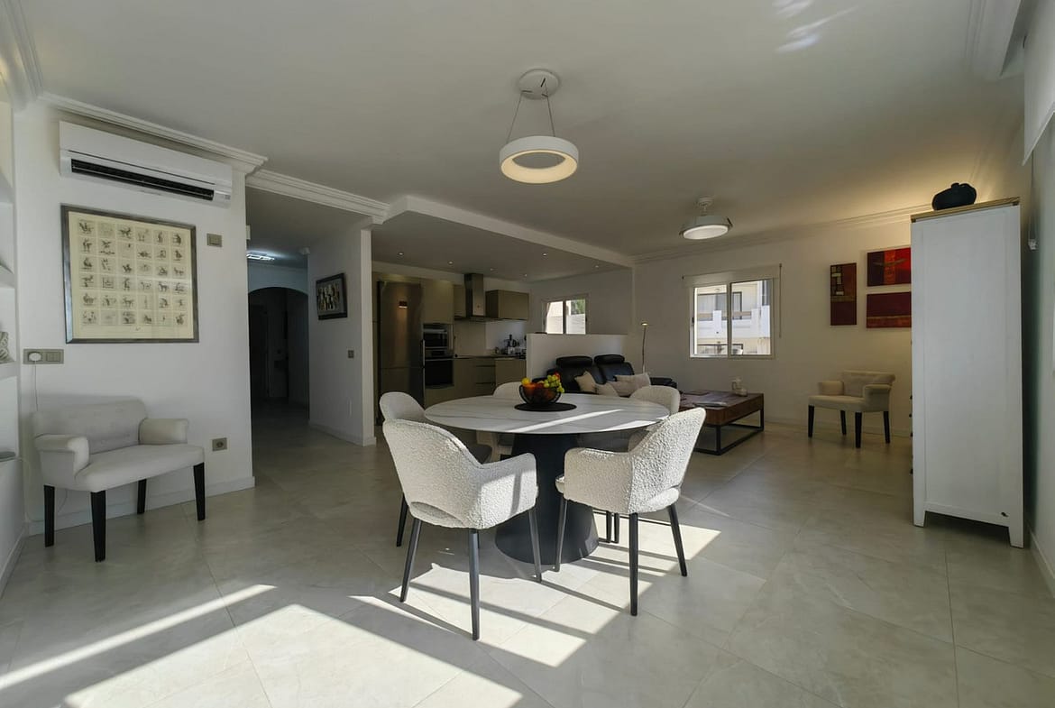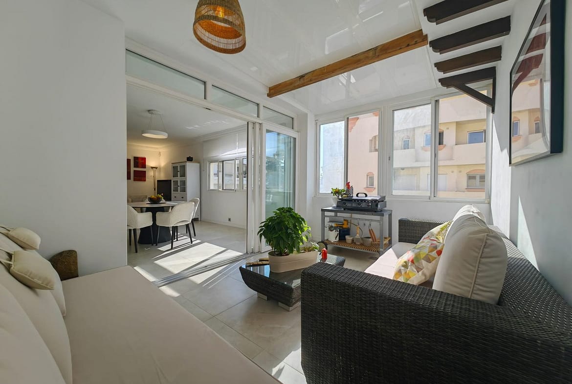 The apartment welcomes you with an elegant central lobby. To the right, a spacious open-plan kitchen, dining, and lounge area unfolds, seamlessly connecting to a covered terrace with a fully furnished lounge — ideal for enjoying sunny mornings and the cooler shade of the afternoons thanks to its southeast orientation.