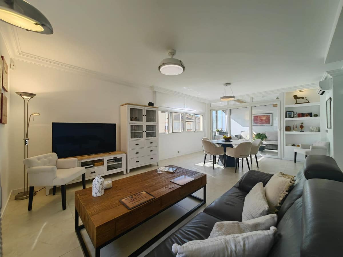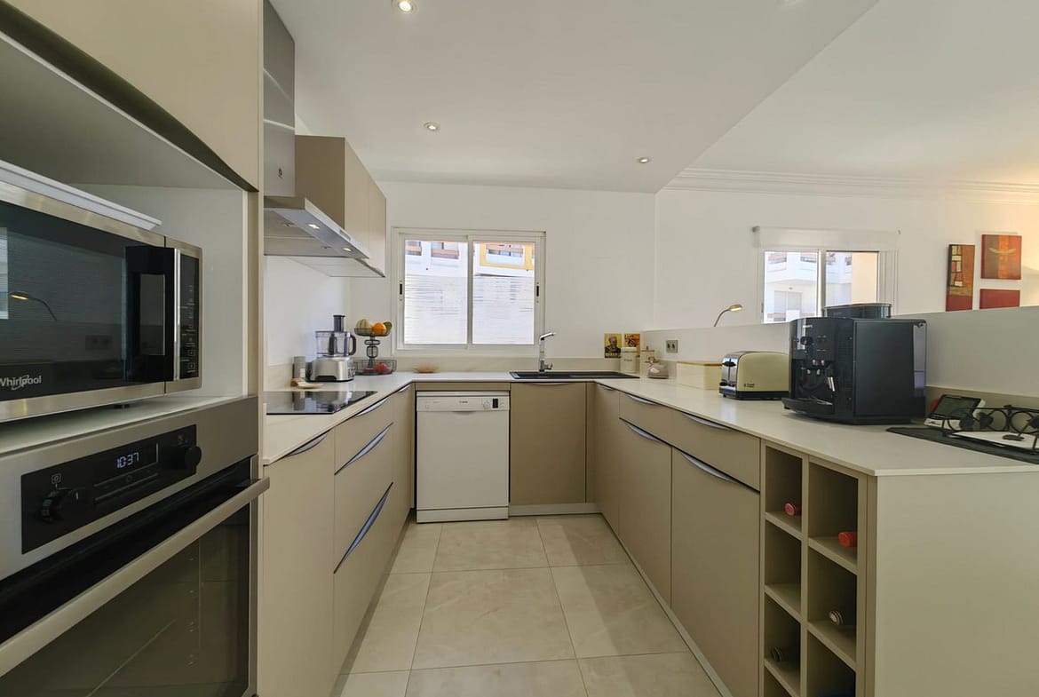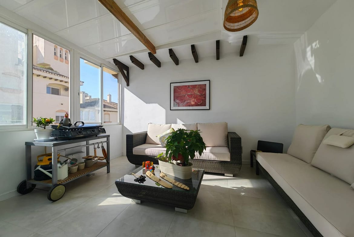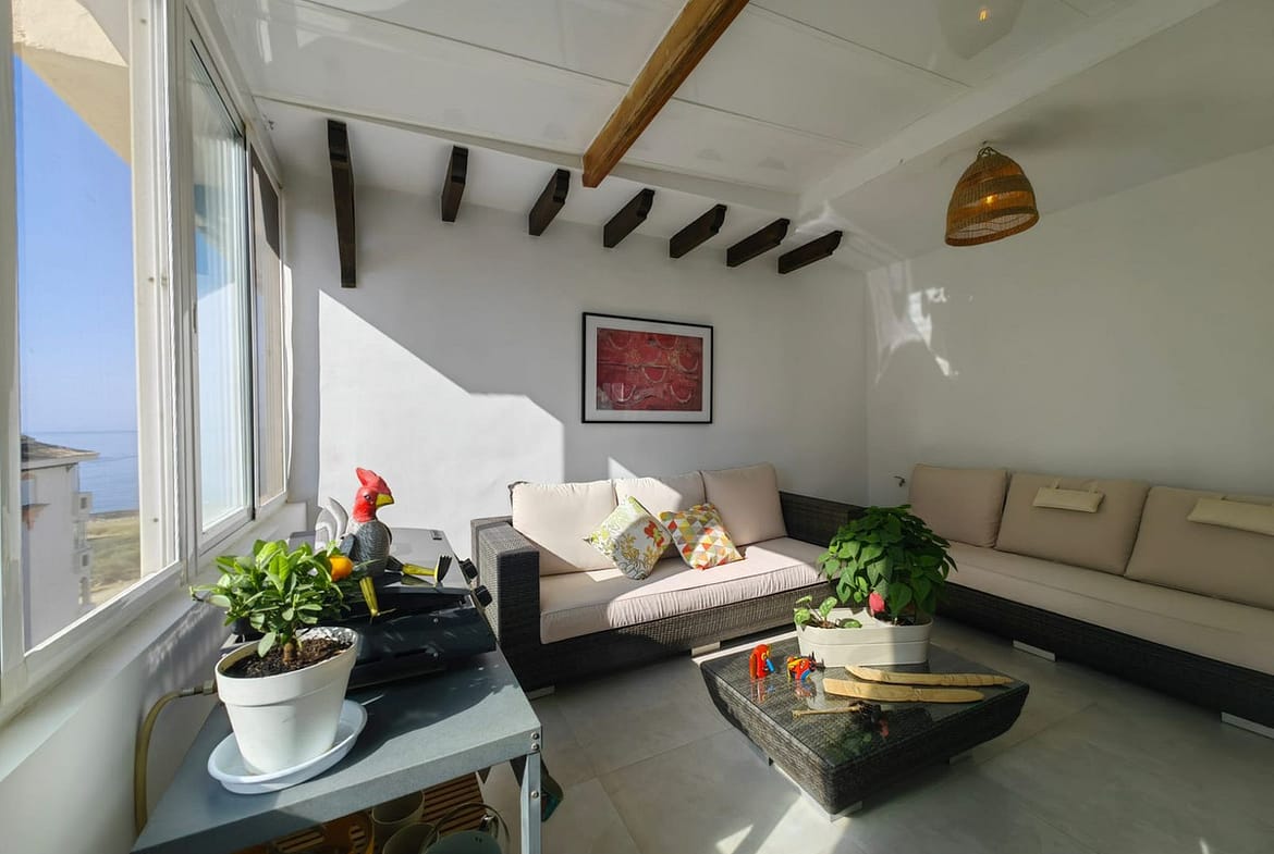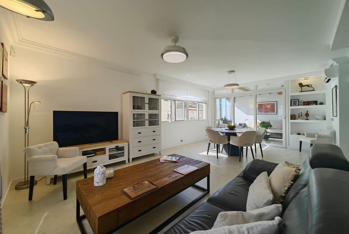 The apartment welcomes you with an elegant central lobby. To the right, a spacious open-plan kitchen, dining, and lounge area unfolds, seamlessly connecting to a covered terrace with a fully furnished lounge — ideal for enjoying sunny mornings and the cooler shade of the afternoons thanks to its southeast orientation.