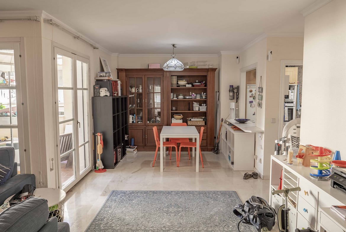 To the left side of the property, you’ll find three spacious bedrooms. The master bedroom includes a large en-suite bathroom and direct access to a private terrace. The two additional bedrooms are also well-sized, both opening onto a large shared east-facing terrace—perfect for morning sun. These rooms share a nearby family bathroom. All bedrooms come equipped with full-length fitted wardrobes, and the apartment includes both high-speed internet and an alarm system already installed.