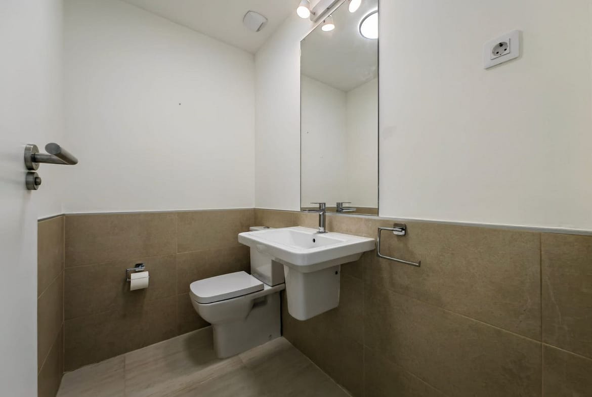 The lower level features a spacious and modern open-plan kitchen, flowing seamlessly into the lounge and dining areas with floor-to-ceiling glass sliding doors that open onto a generous, semi-covered terrace. Perfect for indoor-outdoor living, this space is ideal for relaxing, entertaining, or dining under the sun or stars. A separate, partially covered utility area offers discreet storage and laundry space.