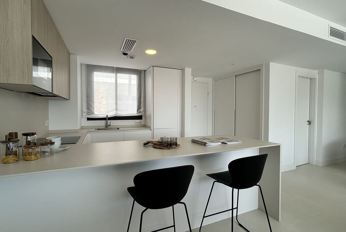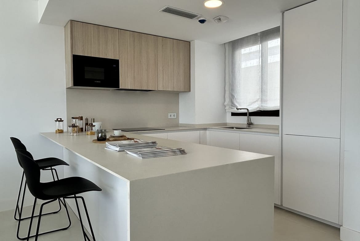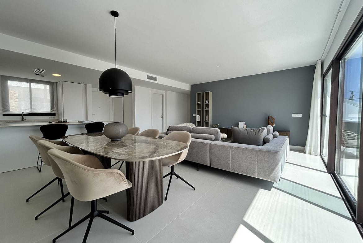 The property comes fully furnished with high-end designer pieces and a comprehensive interior design project by Ikonia Ilusion&Arte, combining selected furniture, lighting, and contemporary tones to maximize the feeling of spaciousness.