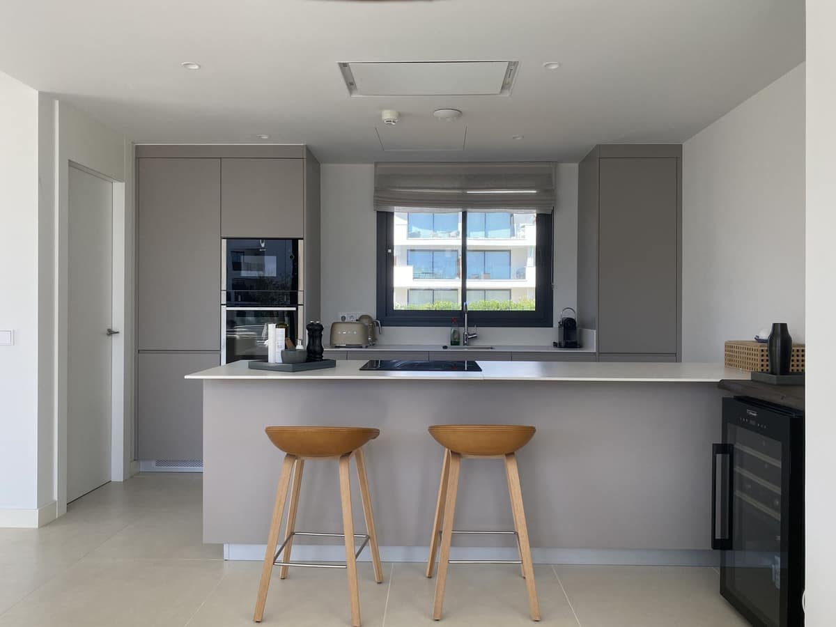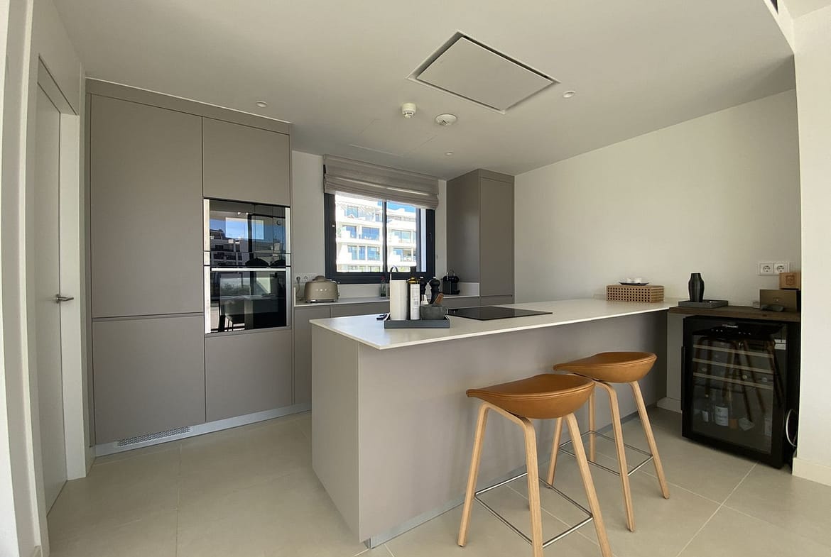Inside, the penthouse offers a bright and welcoming atmosphere with a spacious open-plan kitchen and living area that’s filled with natural light. Large sliding glass doors connect directly to the terrace, creating a smooth transition between indoor and outdoor spaces – perfect for relaxing or entertaining.