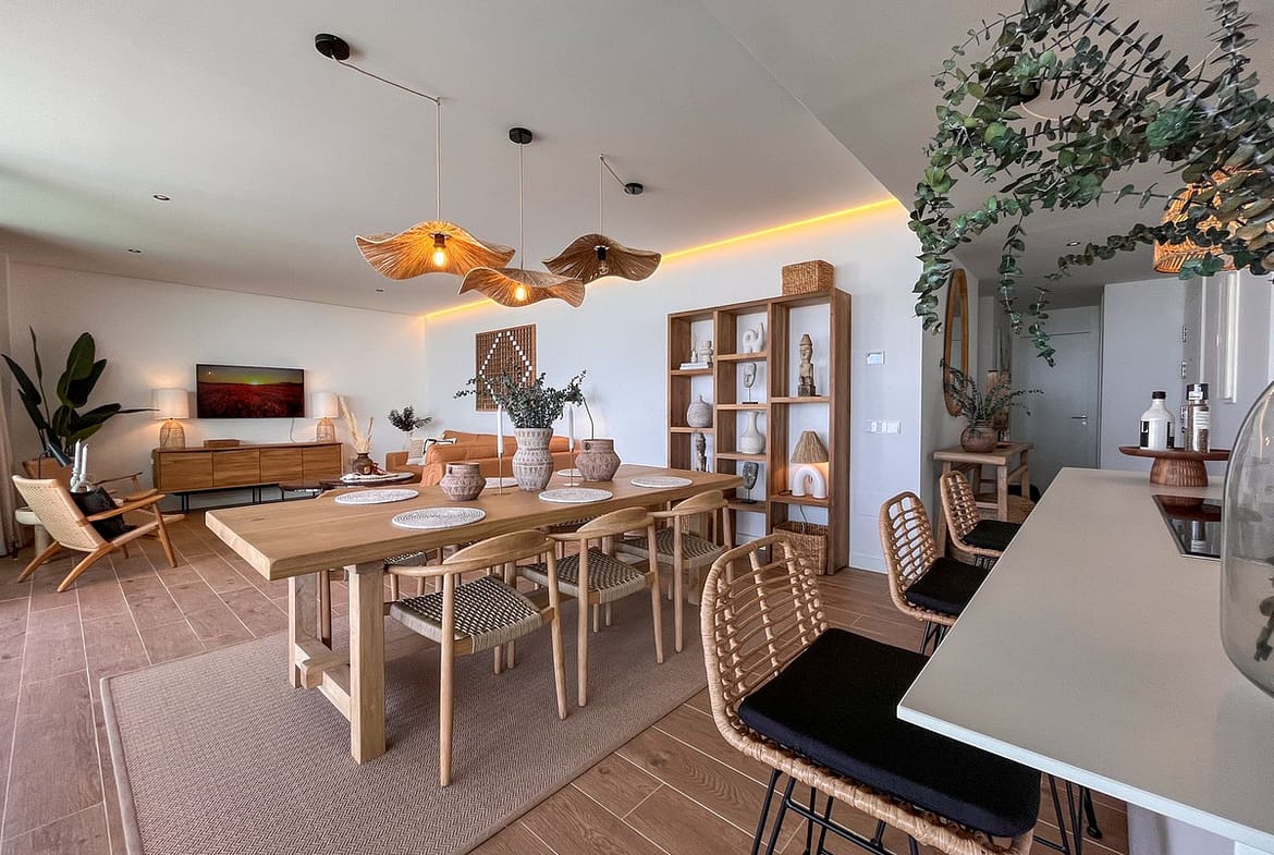 Living Space: Spacious open-plan kitchen and dining area, along with a living room featuring large glass windows that open to a covered terrace and the garden with a private pool.