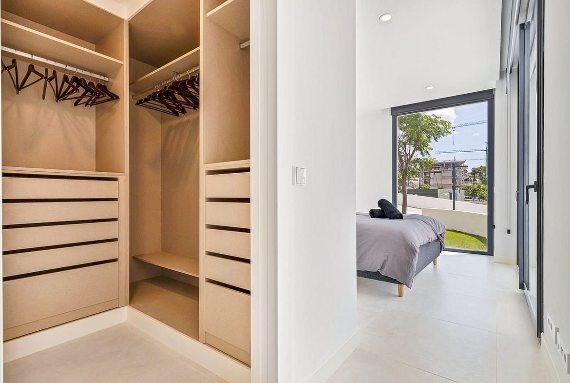A private elevator from the garage whisks you directly to your front door, where a light-filled, open-plan living and dining space welcomes you. The sleek, fully equipped kitchen features premium appliances and a separate utility room for added convenience. Floor-to-ceiling glass doors lead onto an expansive terrace, where you can relax or entertain while enjoying open views of the manicured gardens, shimmering pools, and the Mediterranean Sea.
