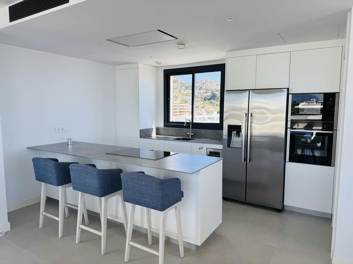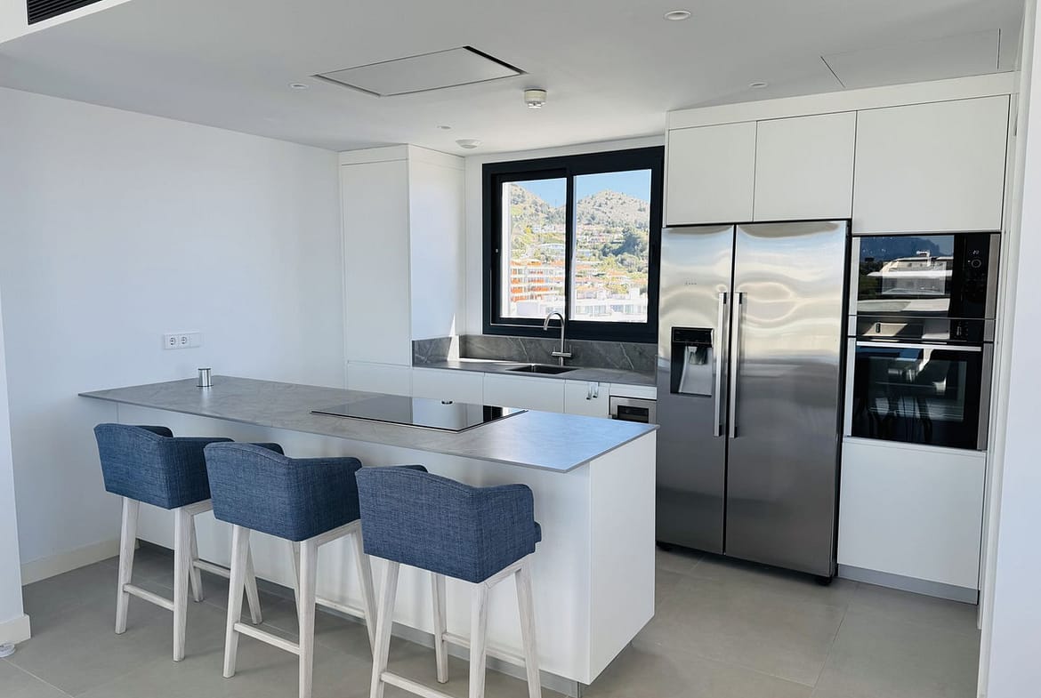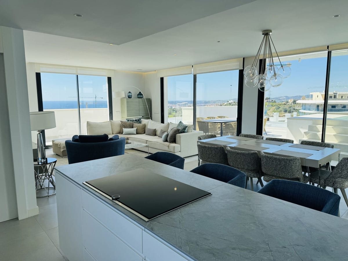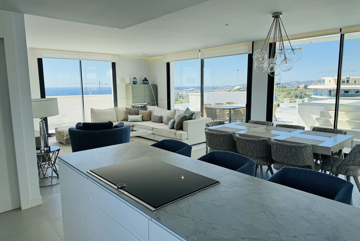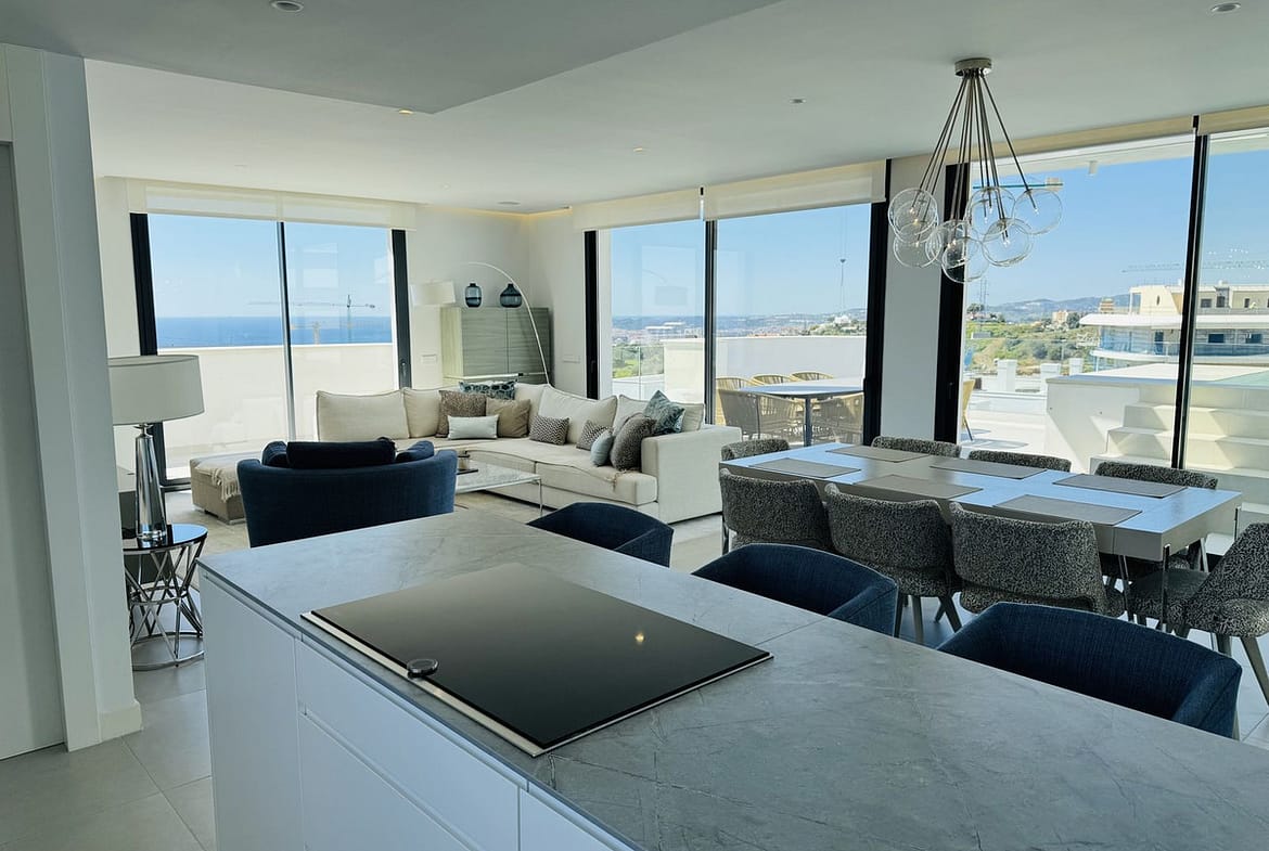 The living room enjoys incredible 180º views of the sea, the entire coast, and the mountains thanks to the large windows with security glass. These open onto the large terrace with a private pool, a dining table for 8 people, sun loungers, and a space designed for an outdoor kitchen/barbecue.