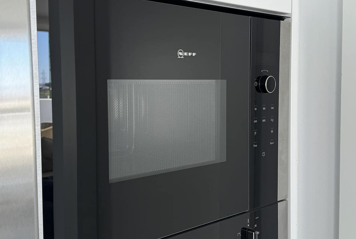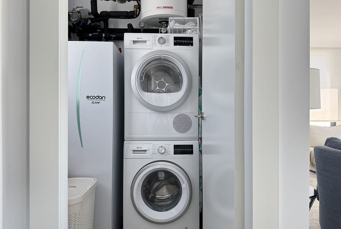 The home can be accessed from the building's stairs and also via elevator from the garage, thanks to a door that opens directly into the spacious living-dining room with an open kitchen fully equipped with high-end Neff appliances. Next to the kitchen is the laundry room with a washing machine, dryer, and aerothermal heat pump.