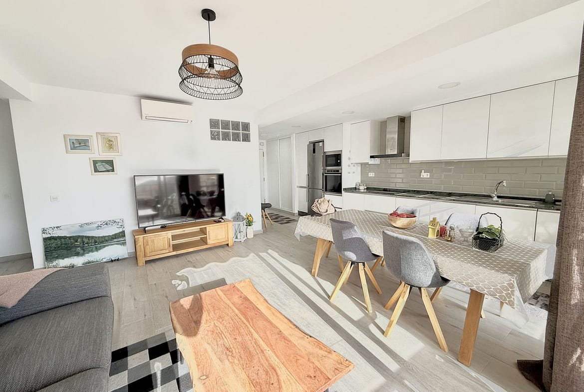 The property features 3 spacious bedrooms, 2 modern bathrooms with walk-in showers, and an open-plan kitchen connected to the living room, creating a warm and inviting atmosphere. It is equipped with air conditioning and high-quality finishes throughout.