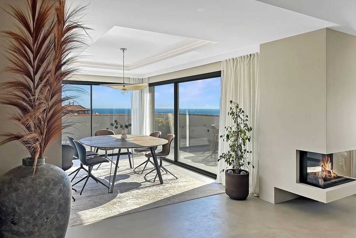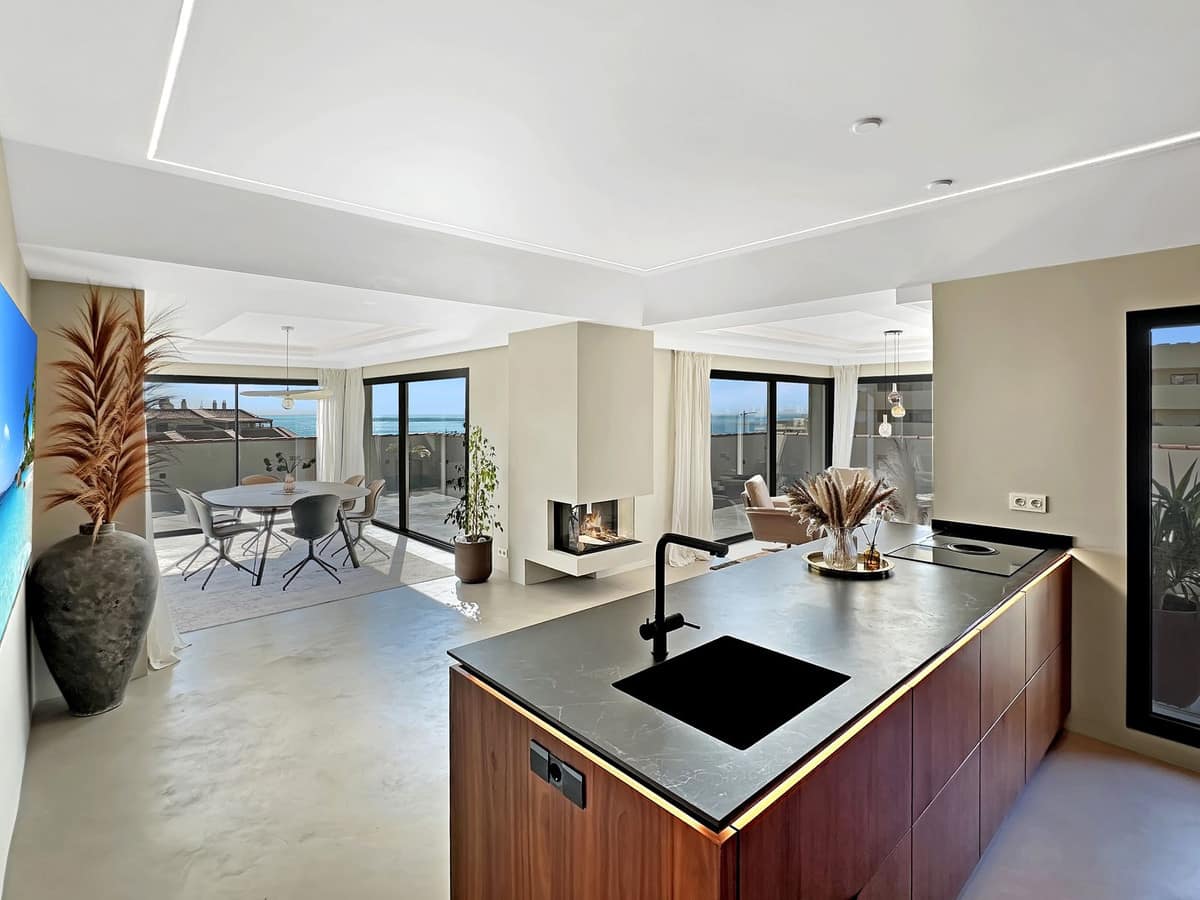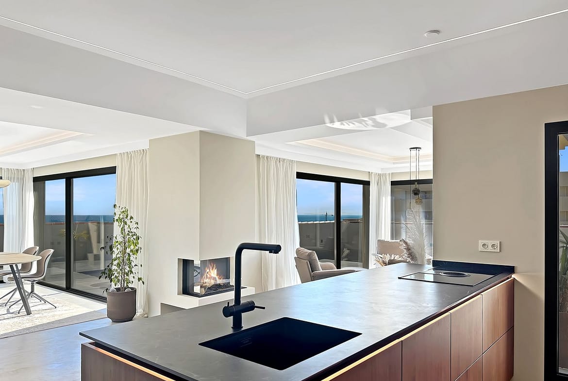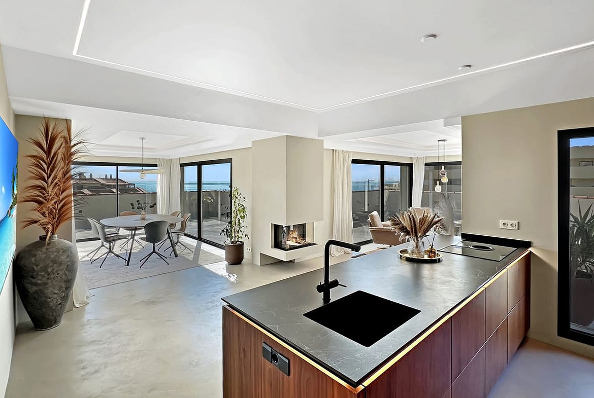 The open-plan layout is the heart of this penthouse. The indoor living space is 135 square meters, featuring a seamless flow between the lounge, dining area, and the stunning kitchen. The kitchen boasts elegant walnut finishes, a composite countertop, fully integrated appliances, and a central kitchen island with an induction cooktop. A cozy fireplace is strategically placed to create a warm and romantic feeling in the open living area on late evenings.