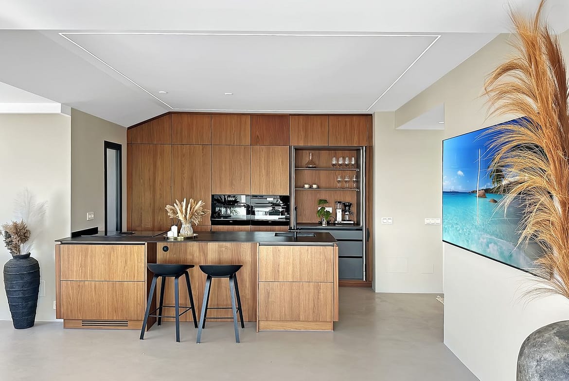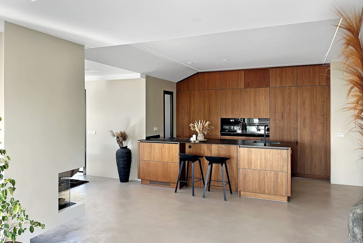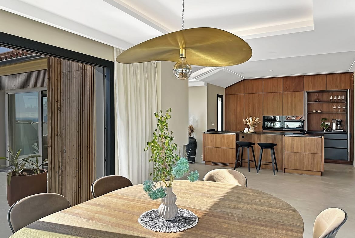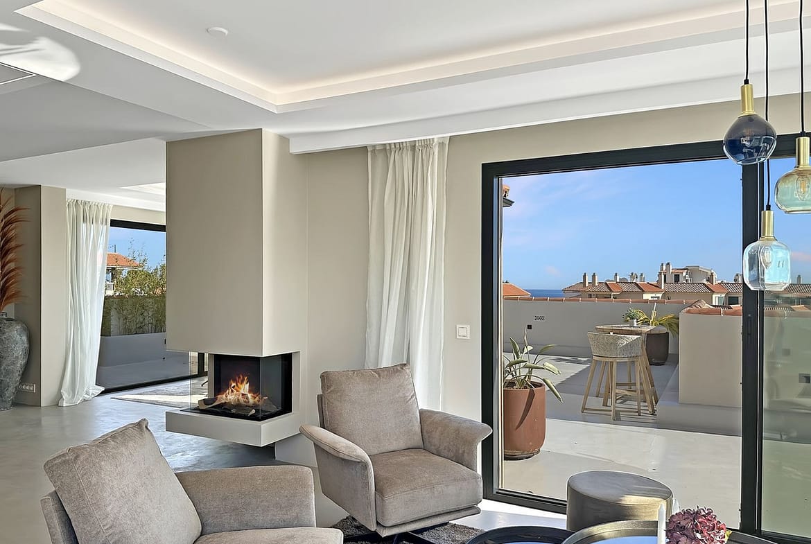 The open-plan layout is the heart of this penthouse. The indoor living space is 135 square meters, featuring a seamless flow between the lounge, dining area, and the stunning kitchen. The kitchen boasts elegant walnut finishes, a composite countertop, fully integrated appliances, and a central kitchen island with an induction cooktop. A cozy fireplace is strategically placed to create a warm and romantic feeling in the open living area on late evenings.