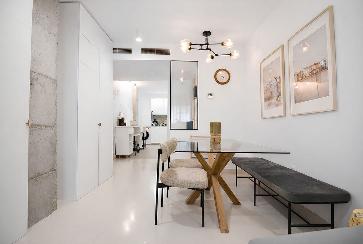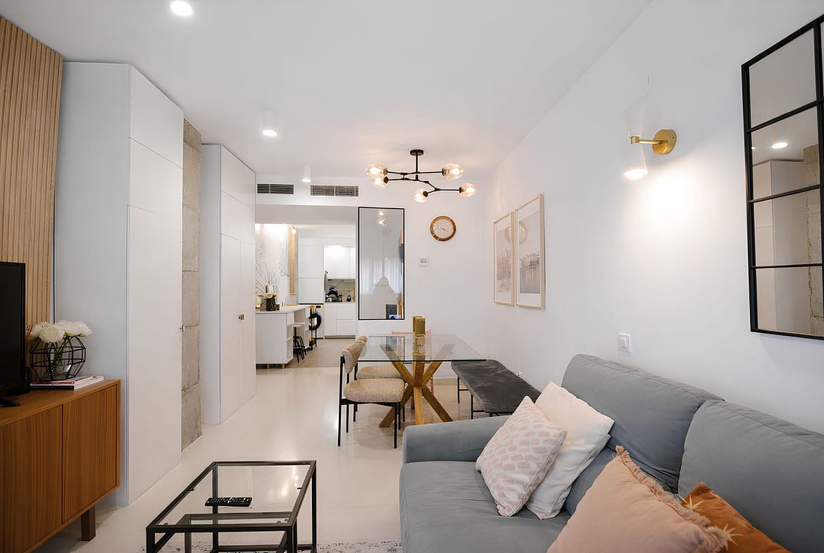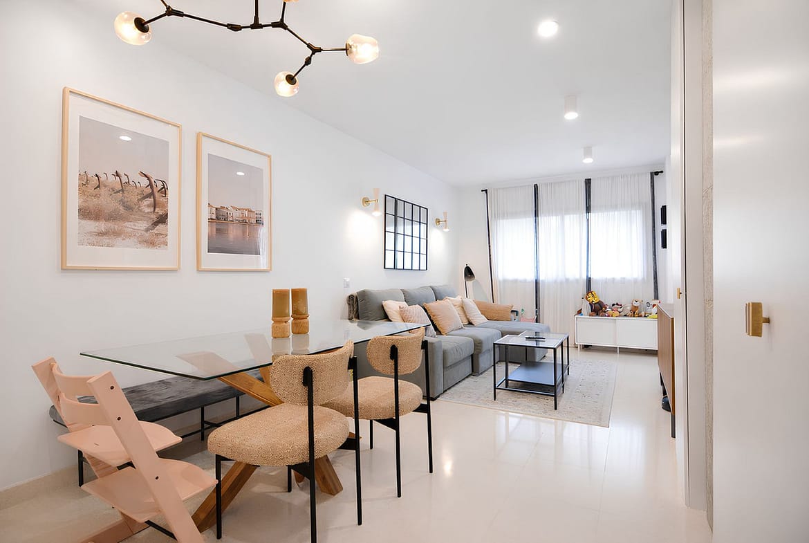 Spacious living dining room with direct access to a southeast facing terrace, perfect for enjoying the morning sun and pleasant sea views