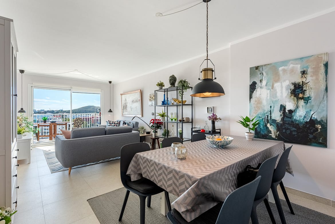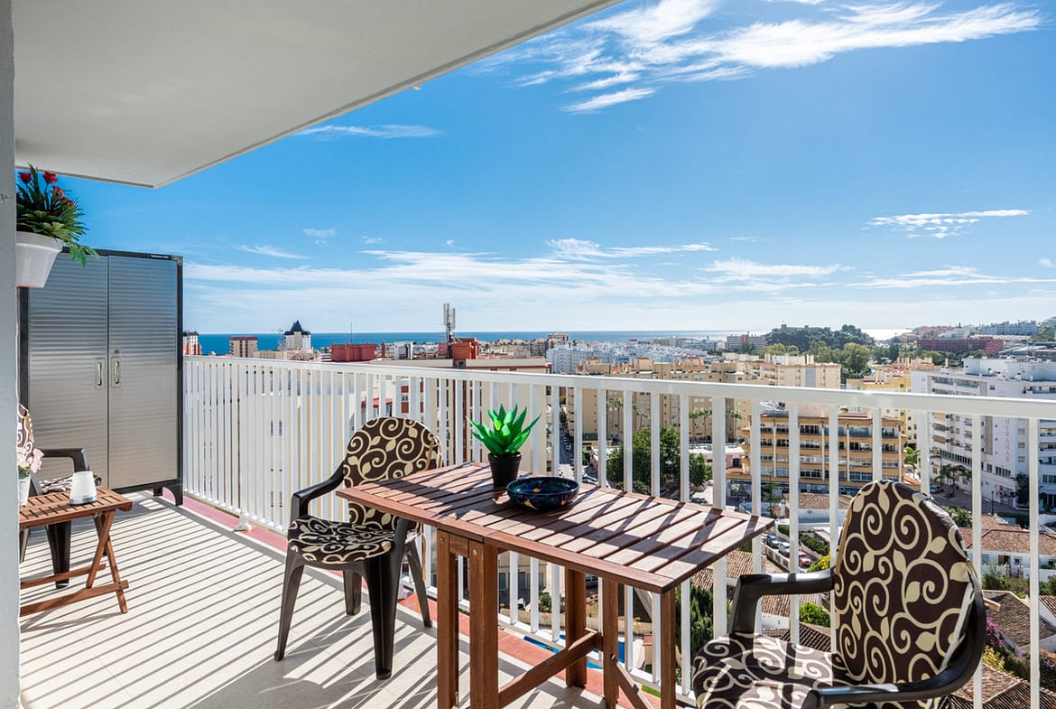 Straight ahead is the spacious and open living area with stunning views over the southwest part of Fuengirola and the sea.