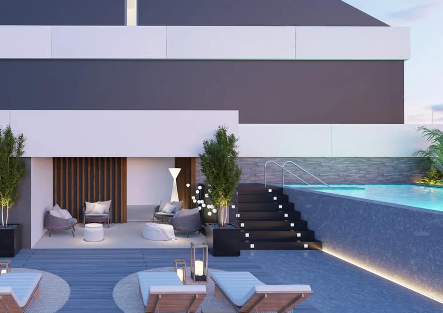 Its elegant style makes this building an example of modern architecture in which everything has been designed with the comfort of its inhabitants in mind. It was created with the vocation to become an emblematic construction of Fuengirola and the entire Costa del Sol. The exterior gardened areas, garages, venues and passageways maintain the elegant and modern style.