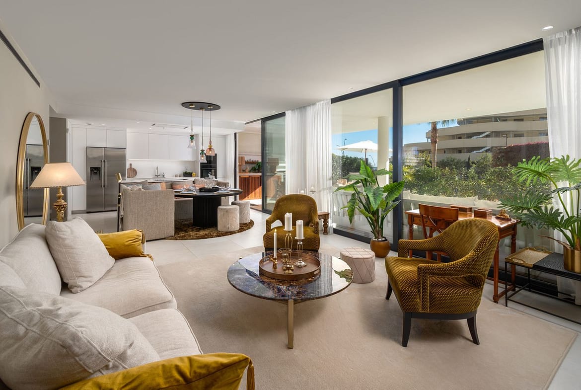 Living Room: Expansive and light-filled with floor-to-ceiling glass doors opening onto the terrace. Generous lounge and dining areas designed for refined entertaining and relaxed living.