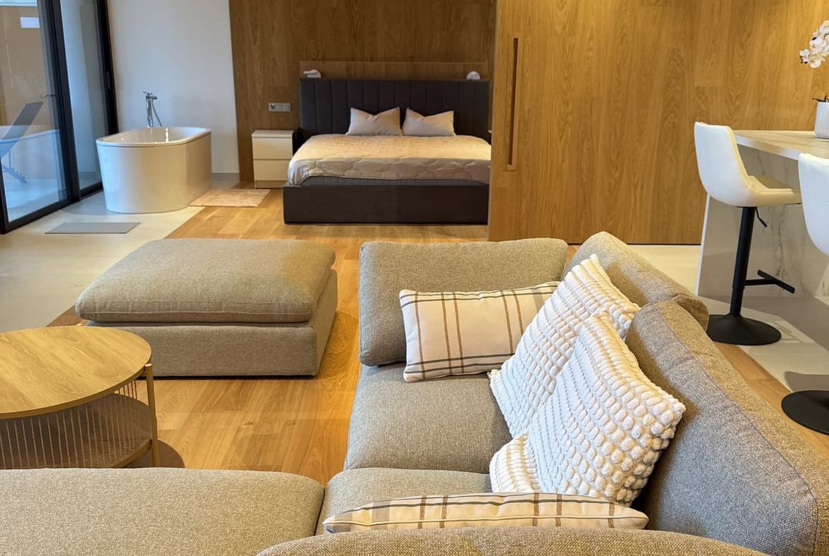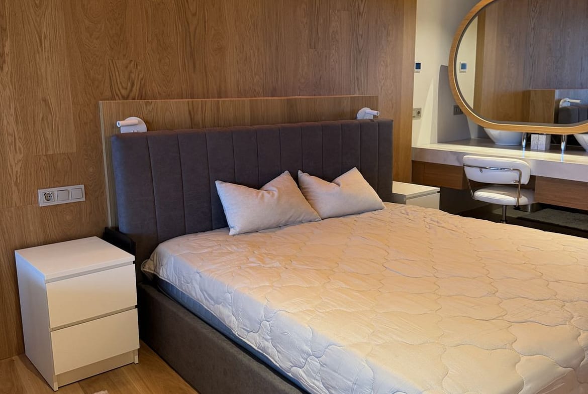 The apartment is located in a peaceful, green neighborhood, situated on a hill, which ensures complete privacy and stunning views. Despite the tranquil setting, the area is well-connected — close to public transport, shops, restaurants, and recreational areas. The beach is just 1 km away.