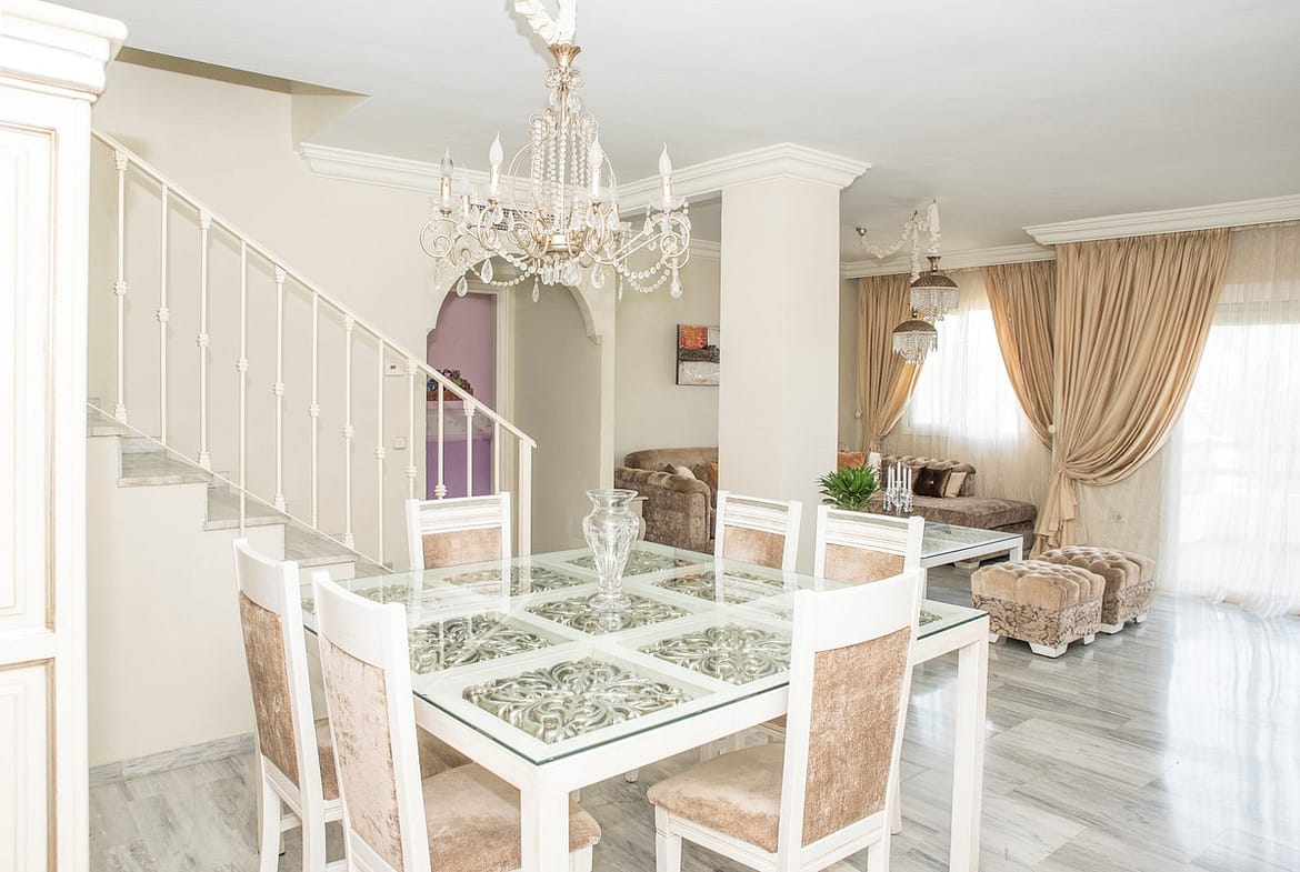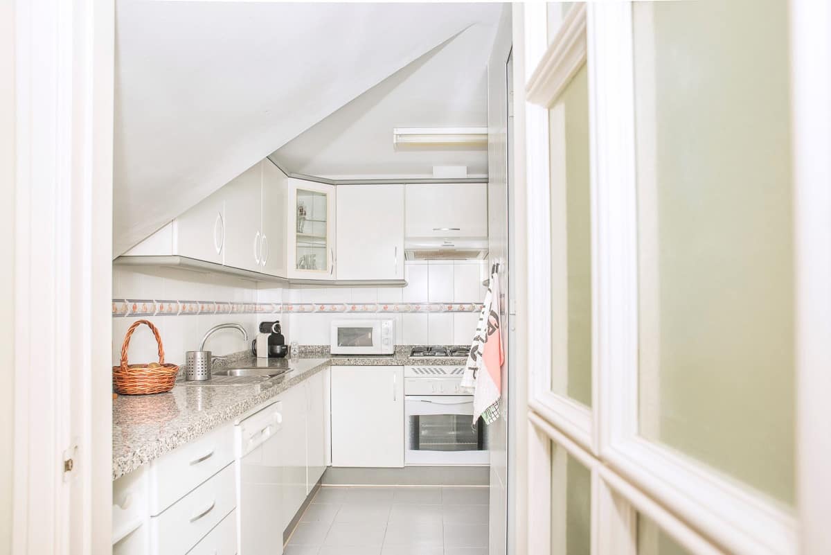 This duplex penthouse is ample and spacious with 3 bedrooms in total. A lovely entrance leads to a fully fitted kitchen with breakfast table and natural light, an independent laundry room, 2 bedrooms and 2 bathrooms, 1 en-suite. A large living room with dining area, working fireplace and good sized stairway to the upper floor. A covered private terrace with views to the golf. The upper floor is entirely dedicated to the master suite with a large bathroom with skylight, a dressing area and a lovely sized bedroom with vaulted ceiling, direct access to an east facing uncovered terrace overlooking the Guadalmina golf course.