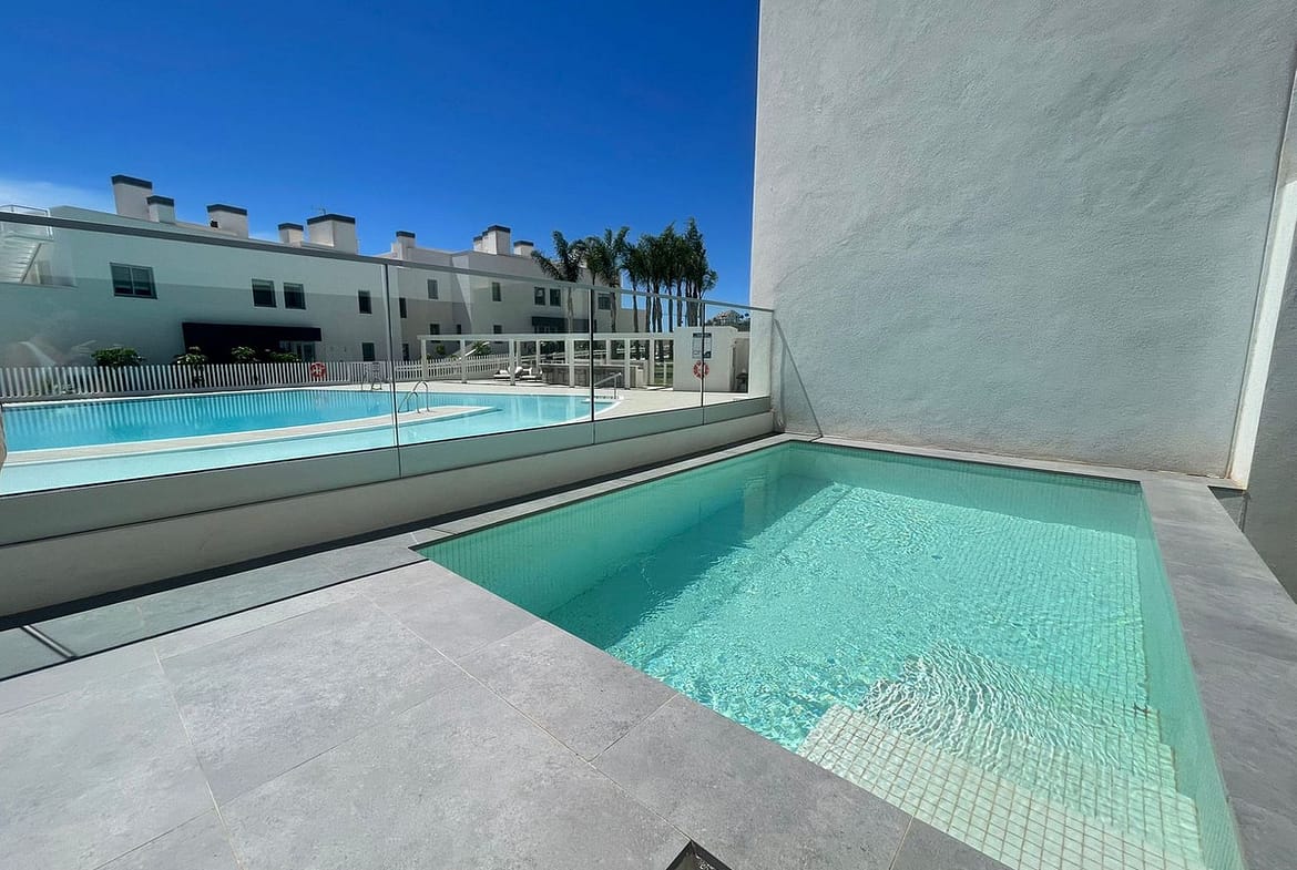 This house has 3 spacious, exterior bedrooms with fitted wardrobes and full ensuite bathrooms, apart from which there is a guest toilet. The kitchen is open to the living room, fully equipped with Neff appliances and has a nice island where the ceramic hob is and the hood is integrated into the ceiling. The kitchen connects with the dining area, where there is a large table with 6 chairs, and with the living room area, where there is a large L-shaped, reclining, electric sofa, a new TV (smart TV), unlimited Wi-Fi. From the living room you go out to the spacious terrace with nice outdoor furniture and private pool, there is also a private shower in the garden. From the private garden there is direct access to the community pool (infinity pool) and the chill out area and community bar. There are two private parking spaces in the underground garage. In the community there is 24 hour security. It is not rented for long periods all year round, only in the winter period from October to March it can be rented for this monthly price, the rest of the year (the summer months) it is rented as a vacation apartment and the price is per night. Also in the winter months apart from the rental price the tenants need to pay for utilities (water, internet and electricity) Do not hesitate to ask us about the prices. We have more units in the same urbanization for rent (and for sale)!