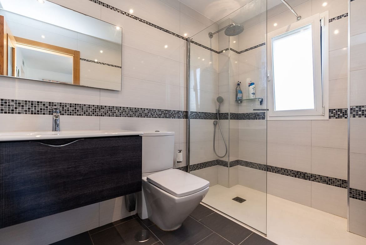 Upon entering the spacious property, you will find the large kitchen and utility area on your left and on the right, there is a roomy living area with easy access to a covered terrace that offers breathtaking views of the sea and mountains. The glass curtains transform this terrace into a beautiful extended living space, perfect for relaxing and enjoying the scenery.