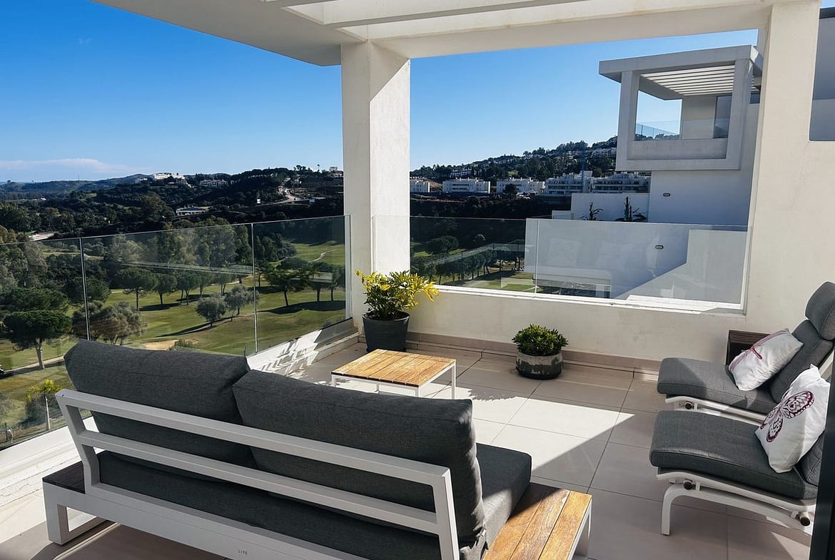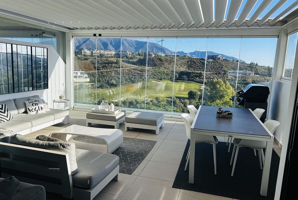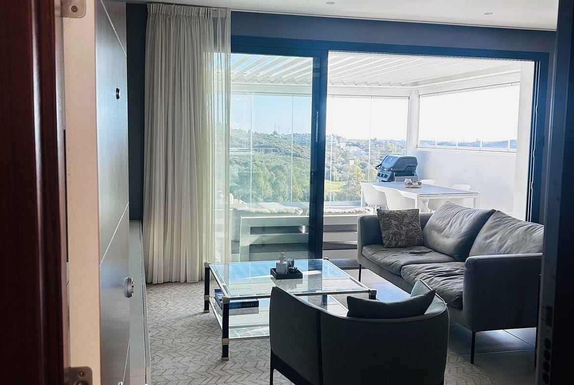The penthouse is situated directly on the frontline of the famous “Campo America” golf course and offers breathtaking panoramic views of the mountains, golf courses and the Mediterranean Sea. It is distributed over 2 floors. On the main floor, the elegant living-dining area opens into a spacious terrace where sunrise become a masterpiece. The open-plan, fully equipped kitchen with Bosch electric appliances is designed for family meals and is complemented by practical utility cabinets. Two additional bedrooms offer comfort and privacy with a stunning view on the golf course and share the guest bathroom.