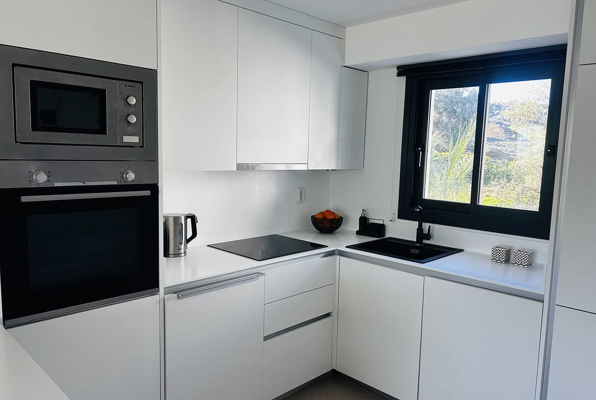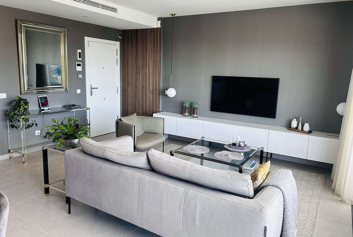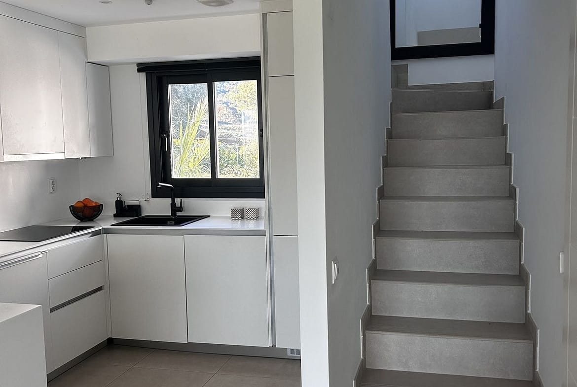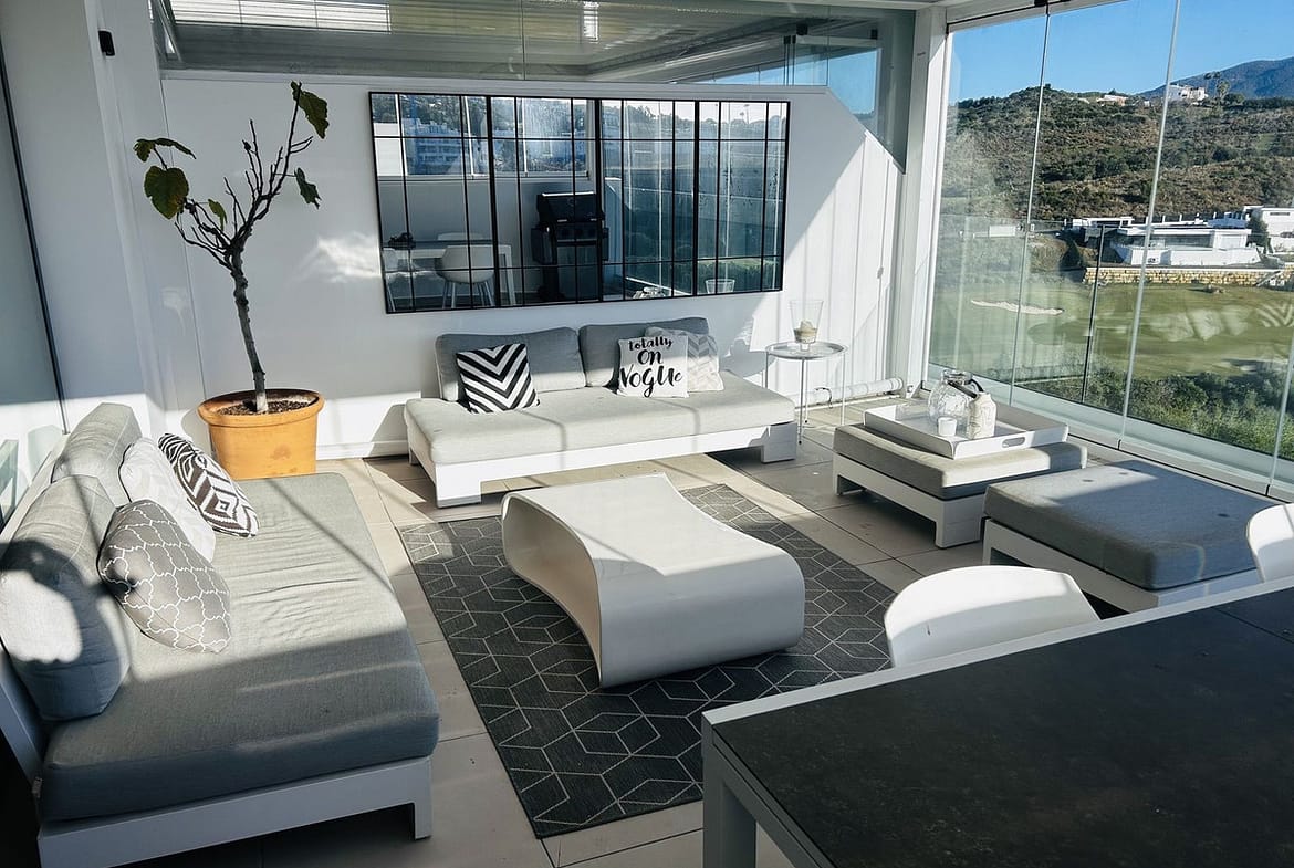 The penthouse is situated directly on the frontline of the famous “Campo America” golf course and offers breathtaking panoramic views of the mountains, golf courses and the Mediterranean Sea. It is distributed over 2 floors. On the main floor, the elegant living-dining area opens into a spacious terrace where sunrise become a masterpiece. The open-plan, fully equipped kitchen with Bosch electric appliances is designed for family meals and is complemented by practical utility cabinets. Two additional bedrooms offer comfort and privacy with a stunning view on the golf course and share the guest bathroom.