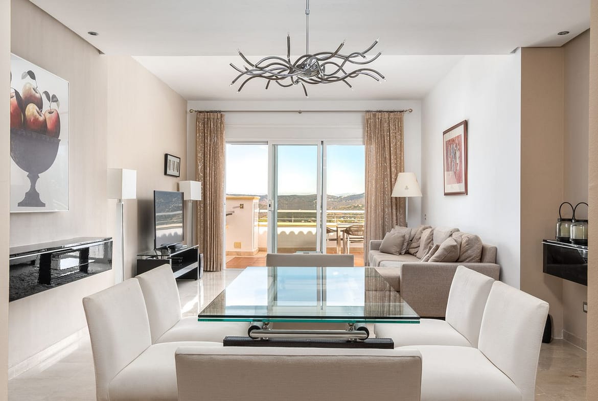 The expansive panoramic terrace offers uninterrupted views across the golf course, the Mediterranean Sea, and the Andalusian mountains a breathtaking backdrop that transforms beautifully at sunset.