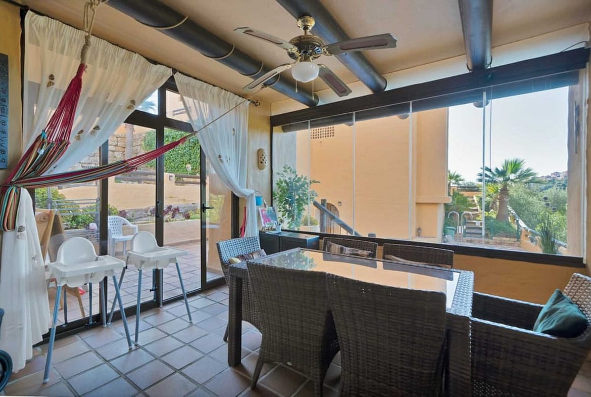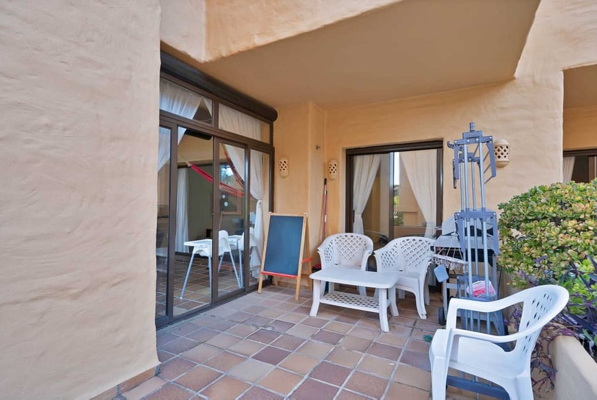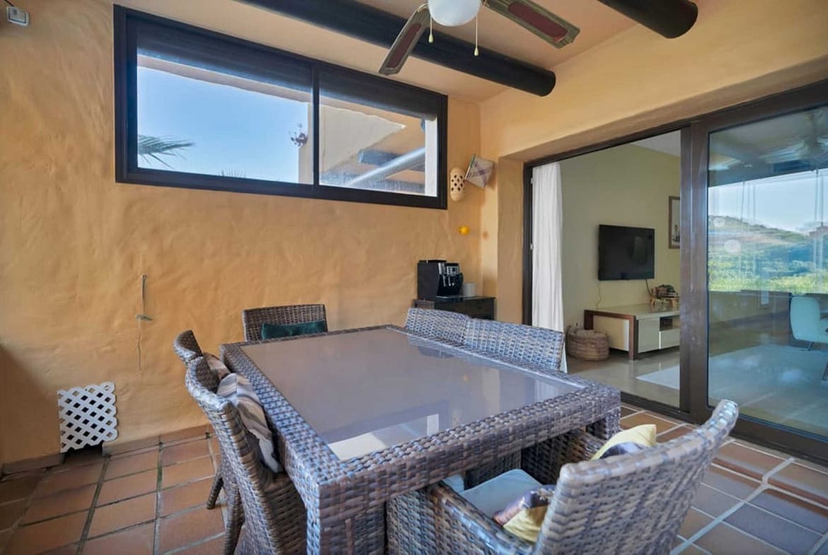 In Manilva, this elegant 3-bedroom ground-floor apartment combines comfort, style, and an unbeatable location. Located within walking distance of the beach, schools, supermarkets, and all amenities, it also offers quick access to Sabinillas, Puerto de la Duquesa, Estepona, and Gibraltar. The fully furnished and ready-to-move-in apartment has 107 m² of built area and an excellent southeast orientation, providing natural light throughout the day. It features a spacious living-dining room with direct access to a large 47 m² terrace with a covered porch, perfect for relaxing or enjoying pleasant outdoor gatherings. It also features a fully equipped kitchen, three bedrooms (one with an en-suite bathroom), and two full bathrooms. It includes a covered parking space, a storage room, and central air conditioning. The complex offers several communal pools, extensive tropical gardens, and a private and peaceful setting, ideal for year-round living or vacation rentals. An impeccable property that stands out for its elegance, comfort, and excellent location on the Costa del Sol. WE RECOMMEND A VISIT!