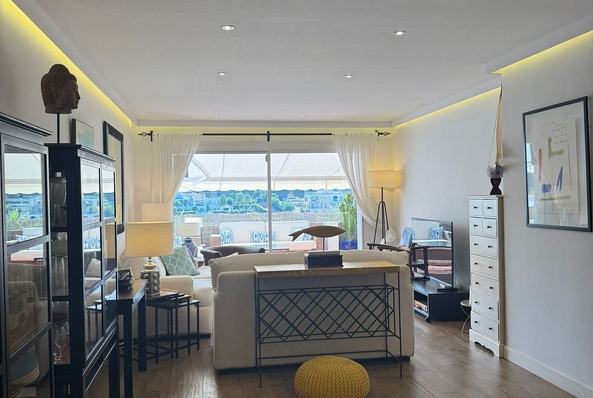 This home, completely renovated with an impeccable Nordic style, features an interior design with neutral tones that provide great light and warmth. With three bedrooms and two full bathrooms, the layout is designed for comfort and functionality. The main bedroom has an en-suite bathroom, while the other bedrooms are spacious and versatile. The heart of the apartment is a cozy and bright living area that extends onto a magnificent, generously sized terrace. This outdoor space is the ideal place to relax and enjoy panoramic views of the golf valley and the sea, in an environment of absolute peace.